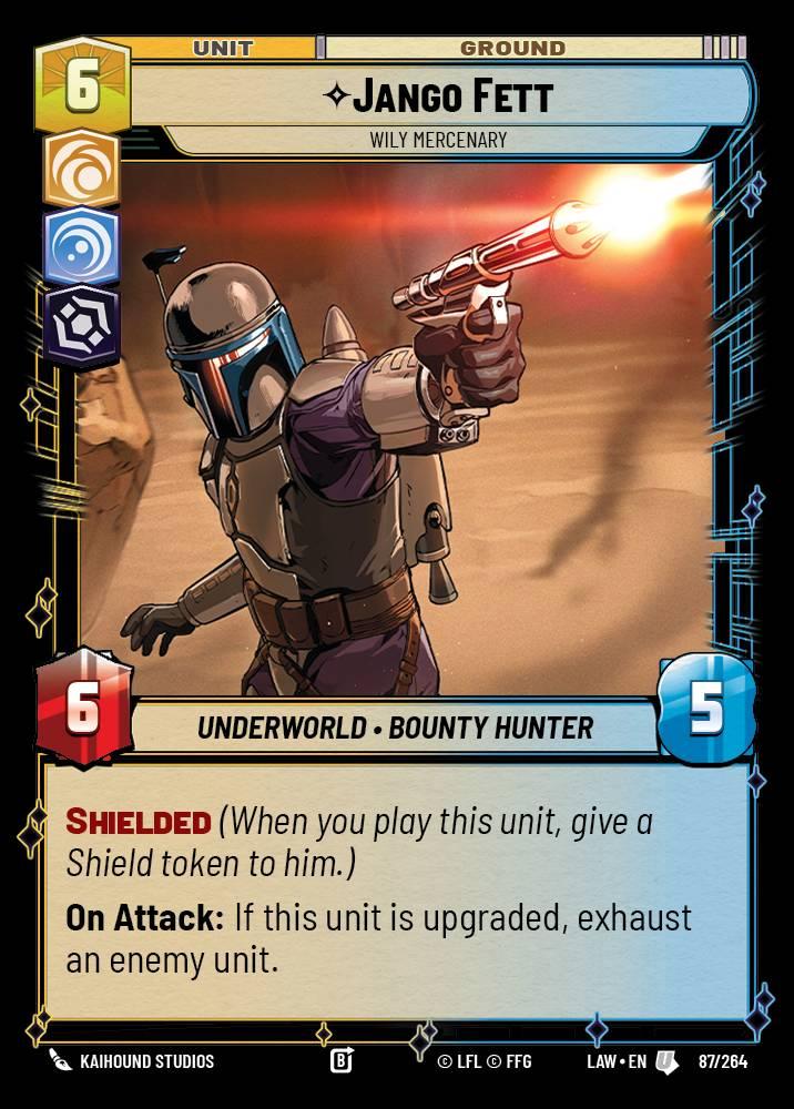 Trading card from the Star Wars Unlimited series featuring Jango Fett as a Wily Mercenary unit. Card details include UNIT: GROUND, cost 6, attack 6, health 5. Special abilities: Shielded (gives a Shield token when played) and On Attack (exhausts an enemy unit if upgraded). Card number 87 out of 264.