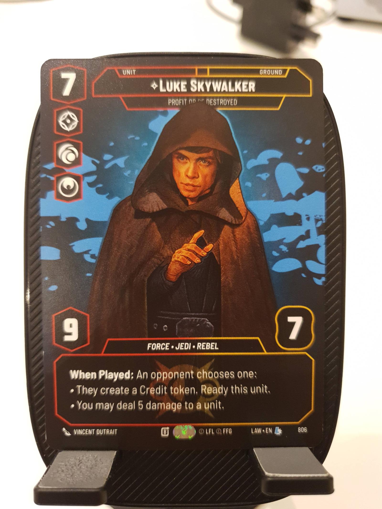 Product Details: When Played: An opponent chooses one: • They create a Credit token. Ready this unit. • You may deal 5 damage to a unit. Rarity:Legendary Number:845 Aspect:Aggression;Cunning;Heroism Card Type:Unit Traits:Force;Jedi;Rebel Cost:7 Power:9 HP:7 Arena Type:Ground Artist:Vincent Dutrait