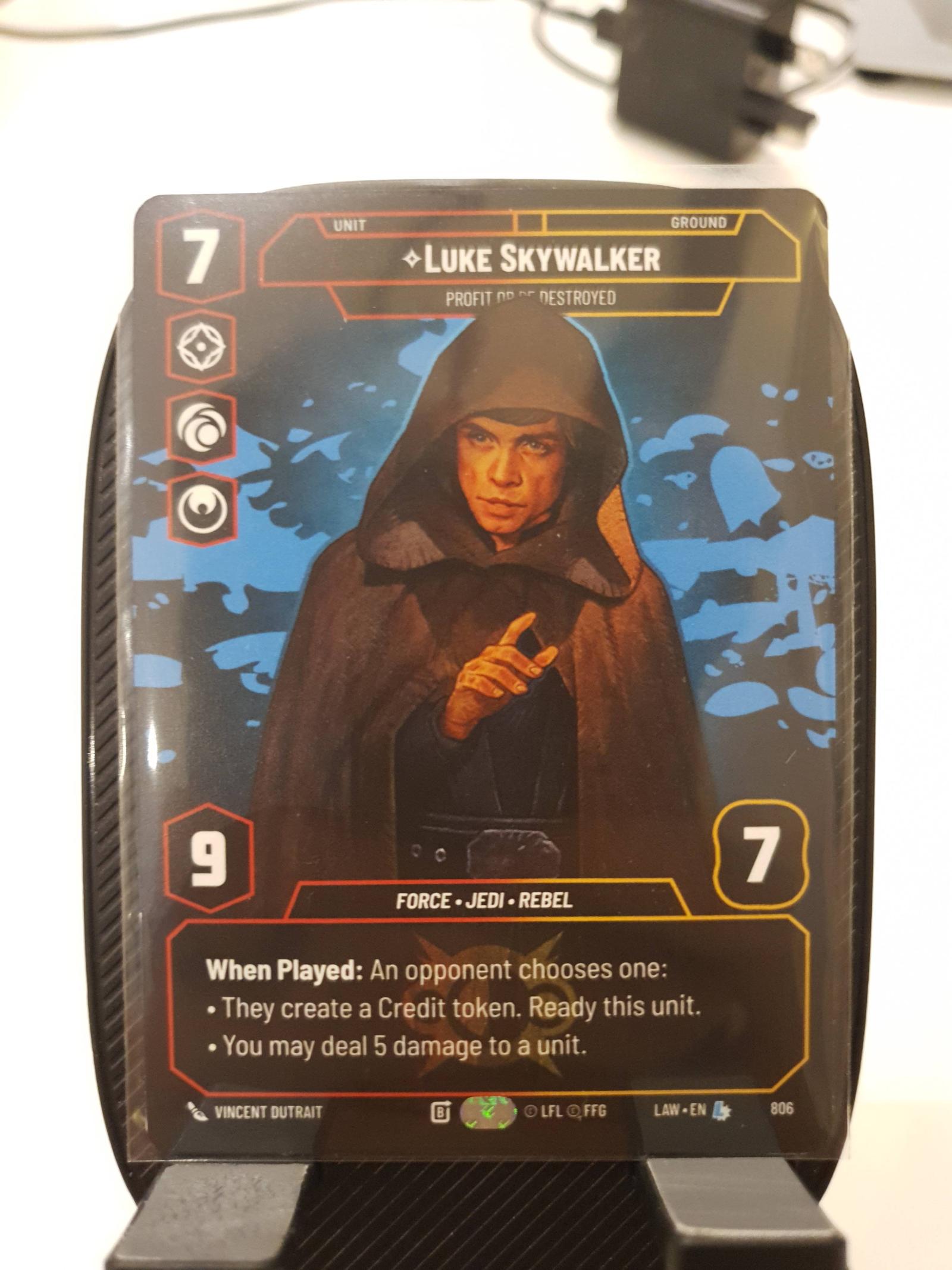 Product Details: When Played: An opponent chooses one: • They create a Credit token. Ready this unit. • You may deal 5 damage to a unit. Rarity:Legendary Number:845 Aspect:Aggression;Cunning;Heroism Card Type:Unit Traits:Force;Jedi;Rebel Cost:7 Power:9 HP:7 Arena Type:Ground Artist:Vincent Dutrait
