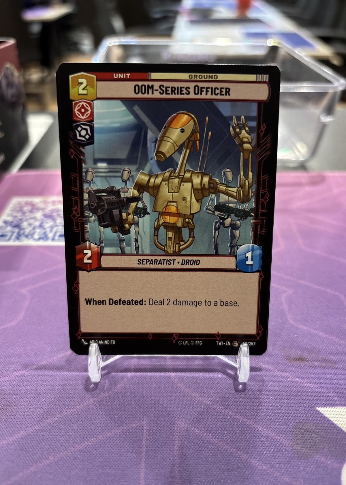 This is an OOM-Series Officer unit card from the Star Wars Unlimited Trading Card Game. This card features a Separatist droid with the ability: 'When Defeated: Deal 2 damage to a base.' Great for collectors and players looking to enhance their droid-themed deck. Card number TWI-EN 137/257.