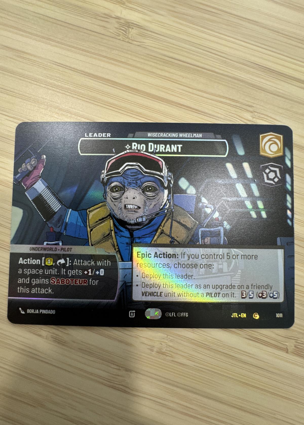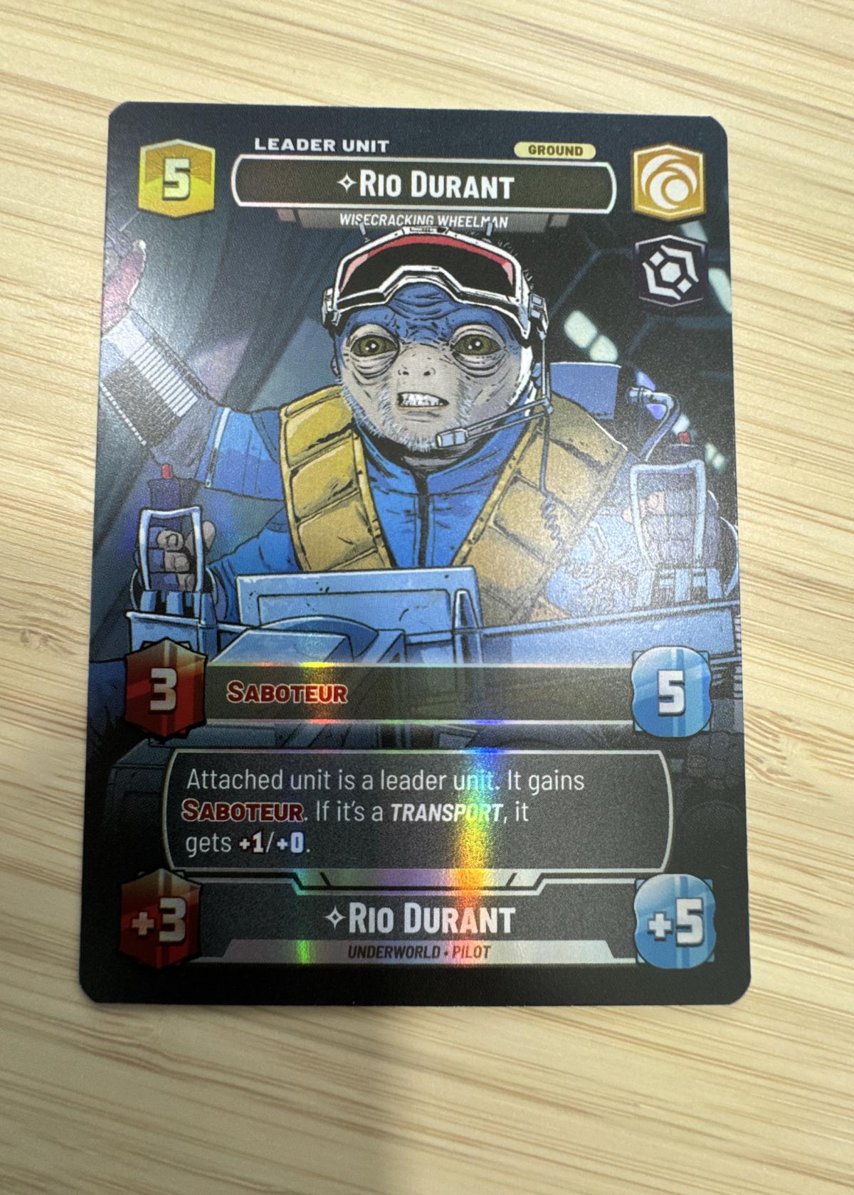 This is a mint condition Rio Durant Leader Unit showcase card from the Star Wars Unlimited Trading Card Game. Featuring the character Rio Durant, known as the wisecracking wheelman and underworld pilot, the card boasts clear, vibrant artwork that captures his unique persona.