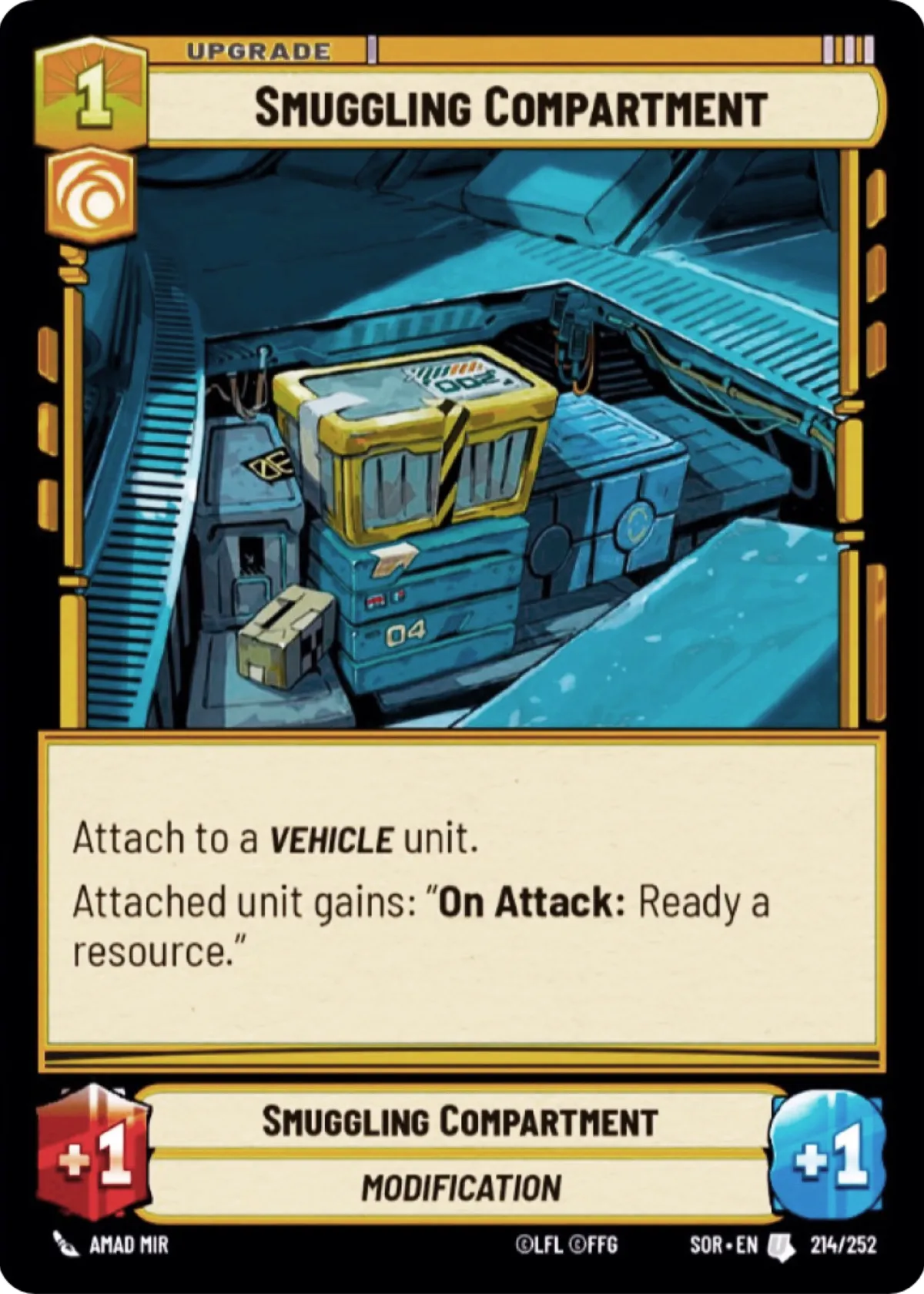 This is a Smuggling Compartment upgrade card from the Star Wars Unlimited trading card game. Card text: Attach to a VEHICLE unit. Attached unit gains: 'On Attack: Ready a resource.' This card is a Modification type with +1 shield and +1 resource icons. English version, number 214/252. Perfect for enhancing your Star Wars Unlimited deck.