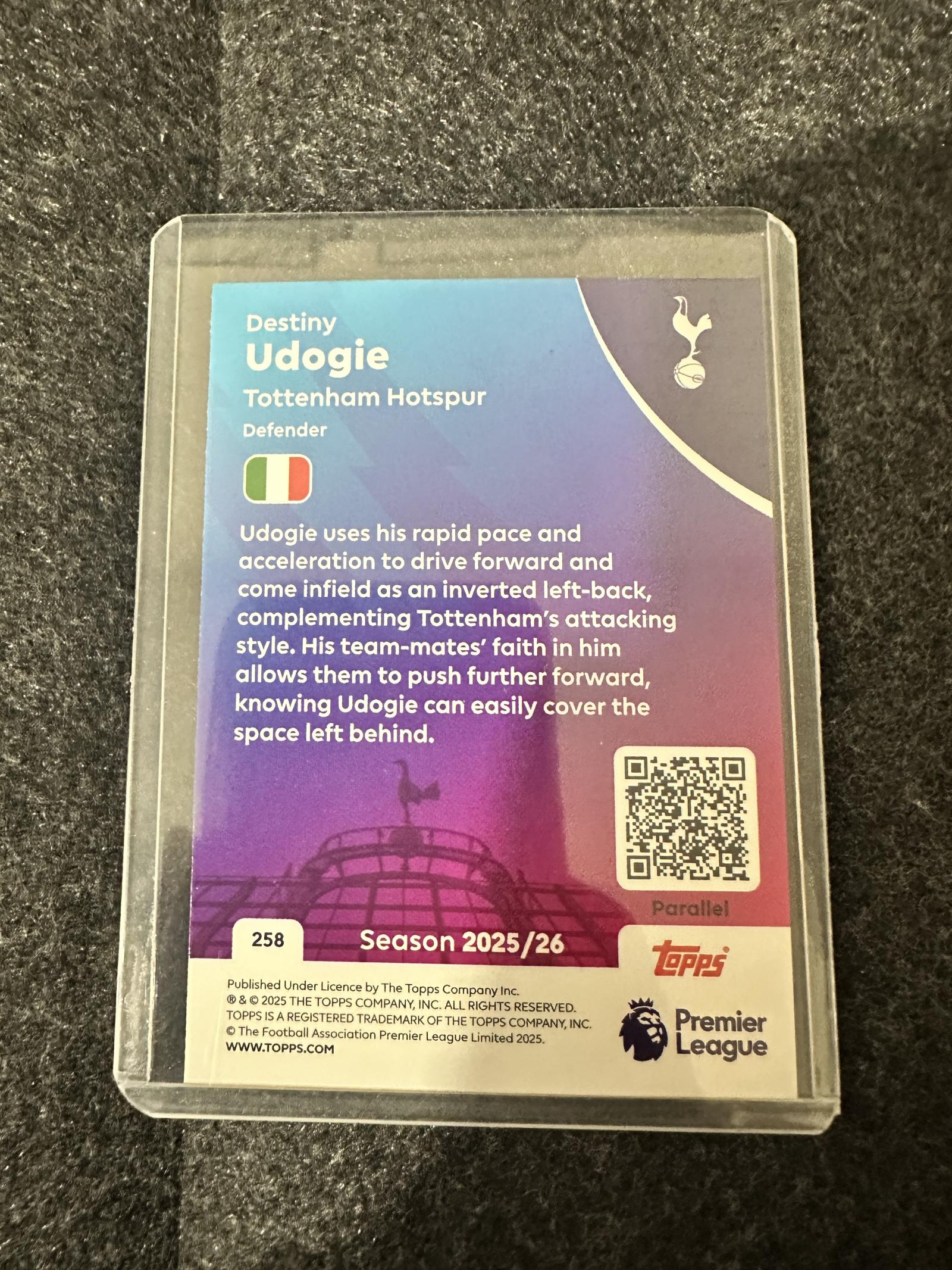A collectible 2025/26 Topps Premier League trading card featuring Destiny Udogie, defender for Tottenham Hotspur. This card highlights Udogie's rapid pace and playing style as an inverted left-back. The card is numbered 258 and includes detailed player info on the reverse. Presented in a clear protective sleeve.