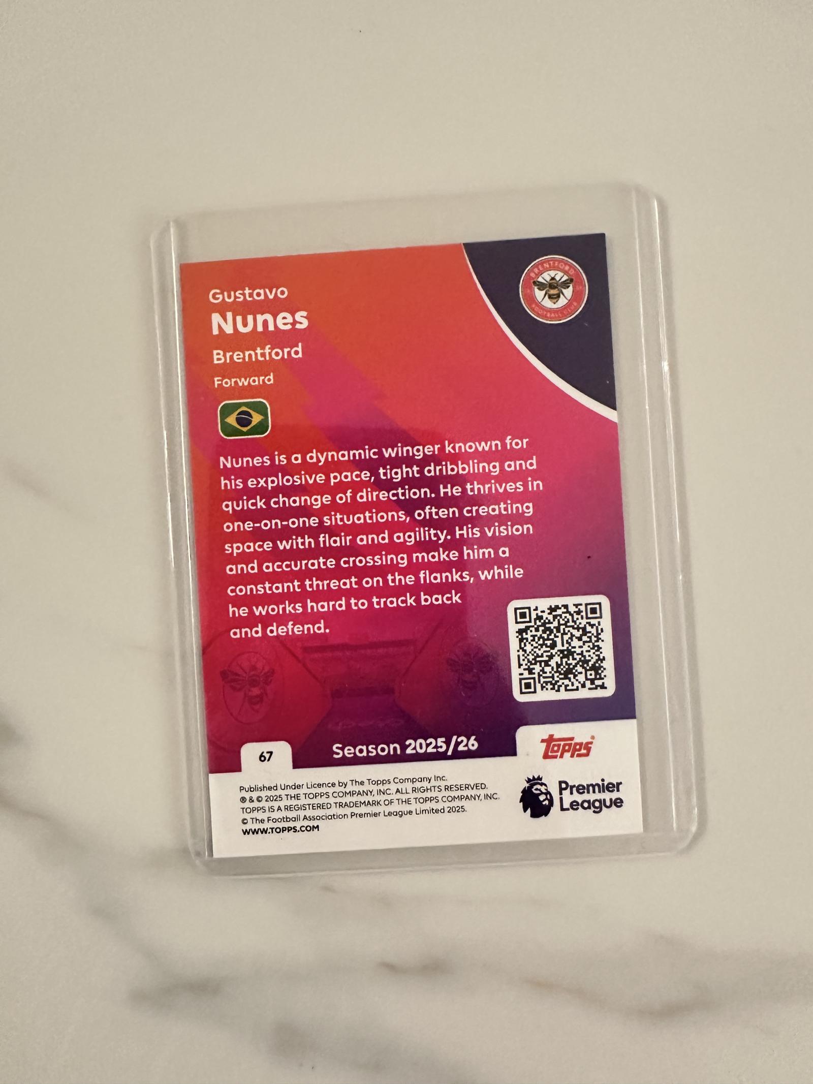 Topps 2025/26 Premier League trading card featuring Gustavo Nunes, forward for Brentford. This rookie card highlights Nunes' dynamic winger abilities, explosive pace, and agility. Card is protected in a clear sleeve for preservation.