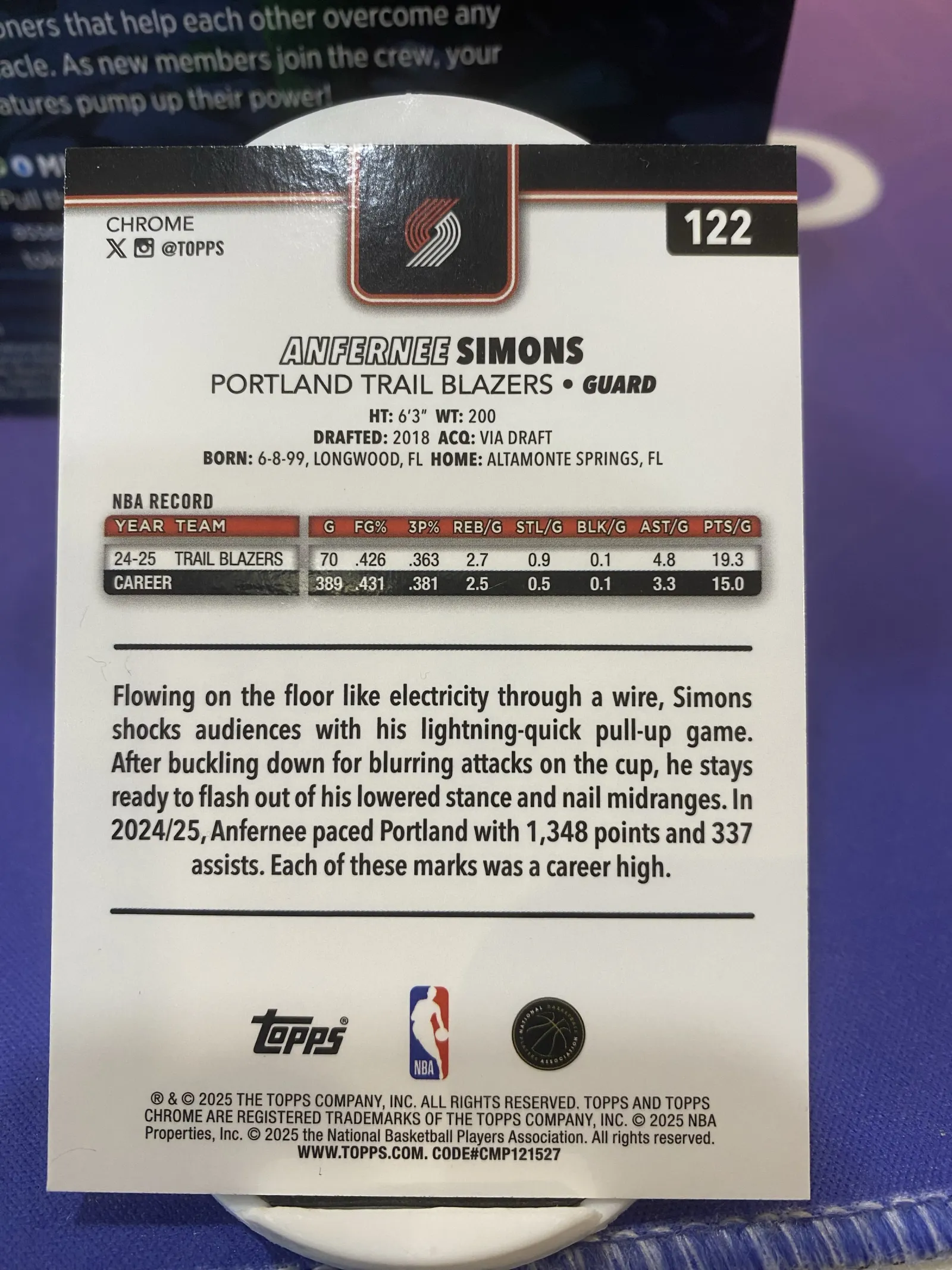 Anfernee Simons Topps Chrome NBA Trading Card