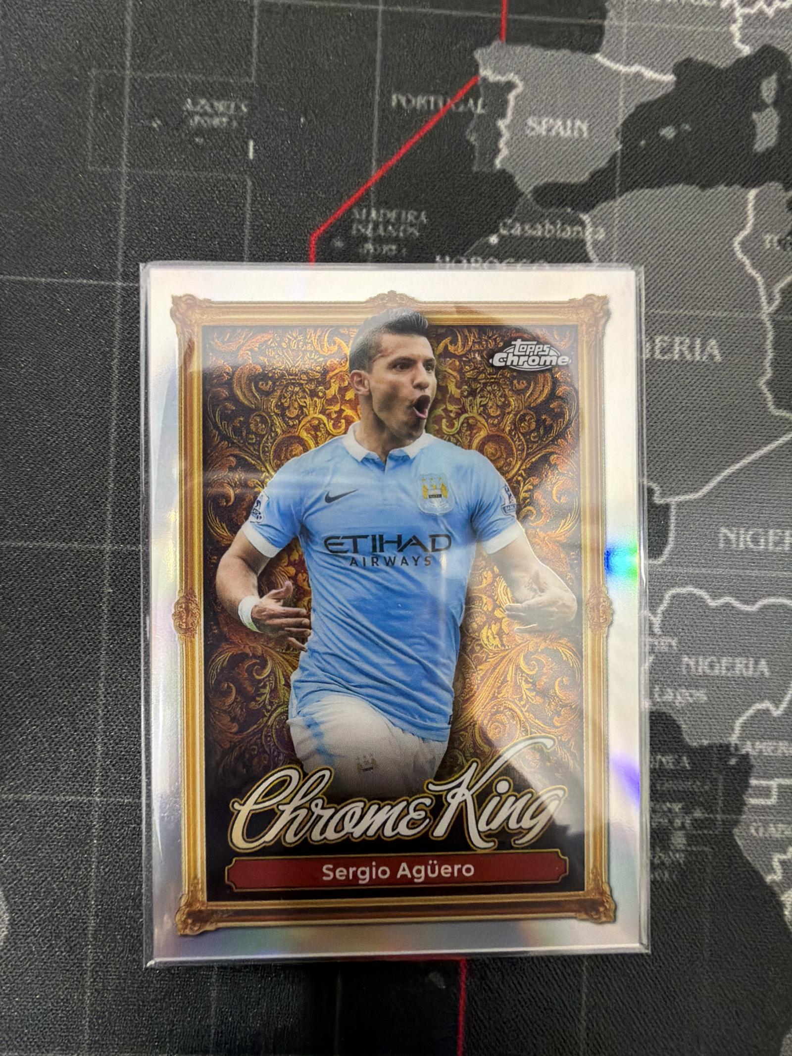 A Topps Chrome King collectible card featuring soccer star Sergio Agüero in Manchester City kit. The card showcases a decorative gold frame design and vibrant colors. Well-preserved in a protective sleeve, this card is a great addition for CCG and soccer card collectors.
