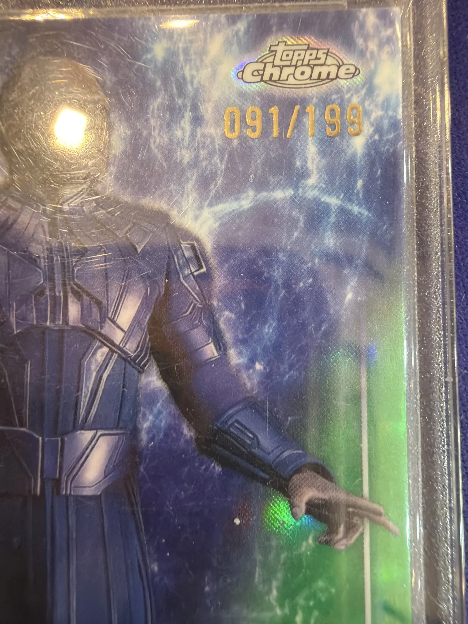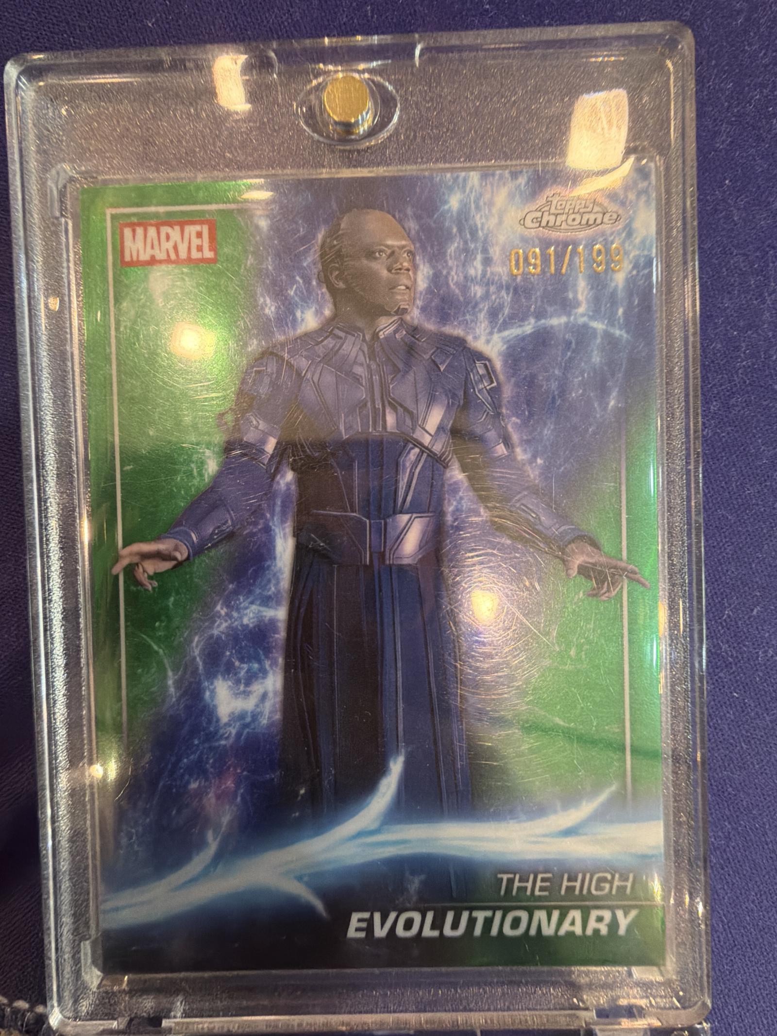 Limited edition Topps Marvel Chrome collectible card featuring The High Evolutionary, numbered 091 out of 199. The card showcases vibrant colors with a green refractor finish. It is encased in a protective plastic holder. Great addition for Marvel and Topps card collectors.