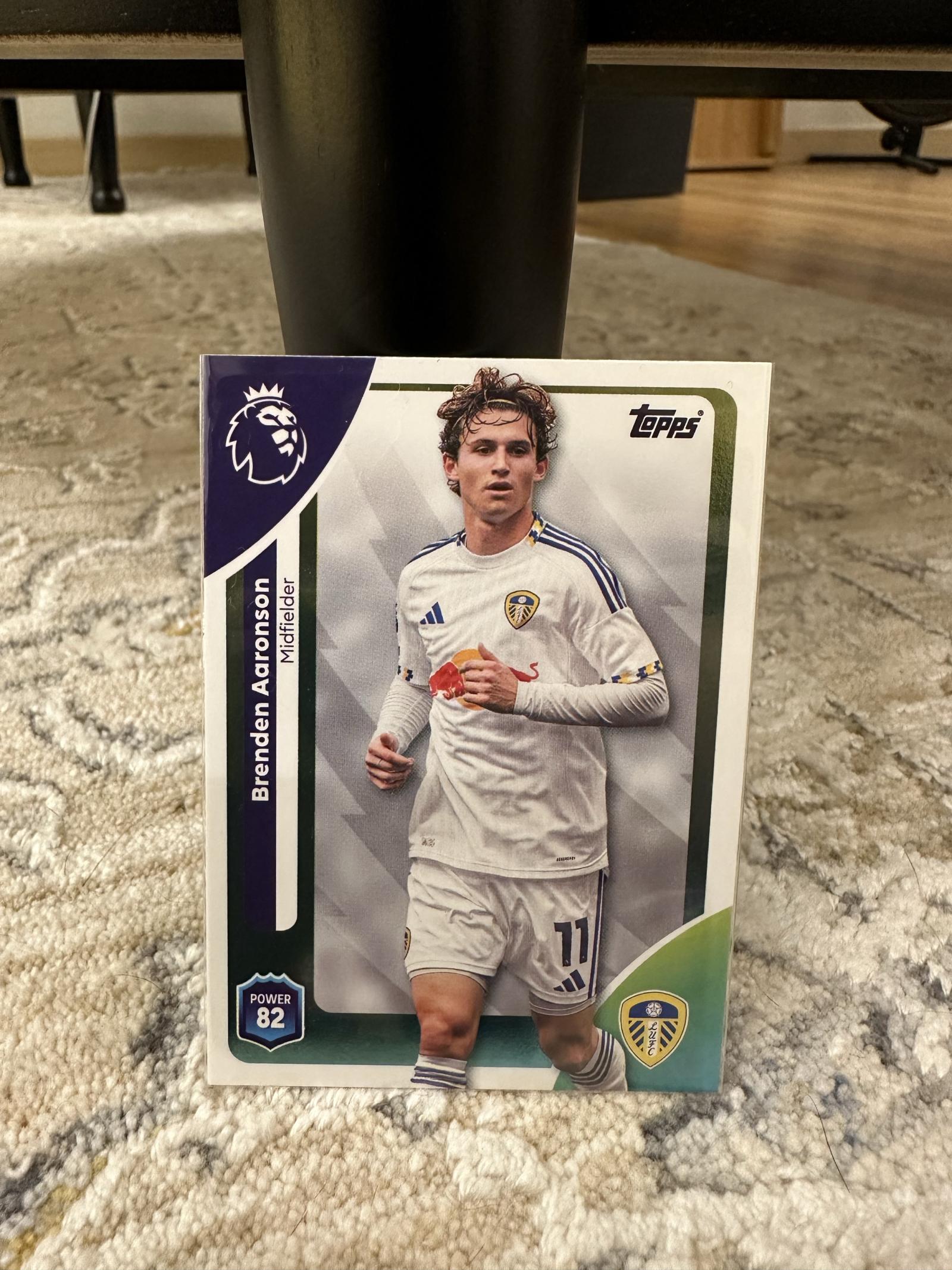 A collectible Topps Premier League trading card featuring Brenden Aaronson, midfielder for Leeds United. The card includes a power rating of 82 and features a high-quality image of the player in team kit. Suitable for collectors of soccer and Topps cards.