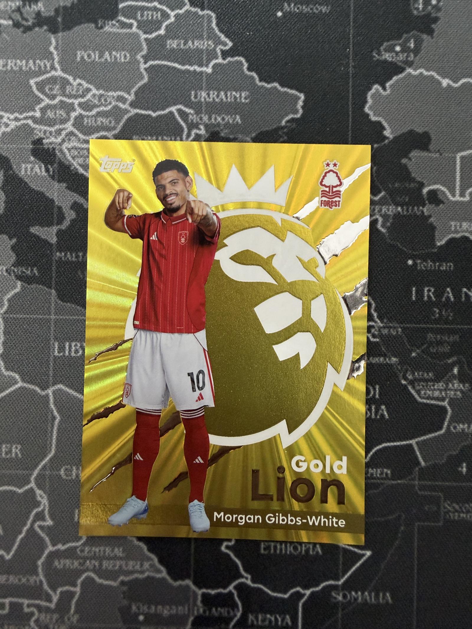 A Topps collectible card featuring Morgan Gibbs-White in Nottingham Forest kit, part of the Premier League Gold Lion series. The card displays a vibrant gold background with embossed Premier League lion design. A great addition for fans and collectors of Topps football cards.