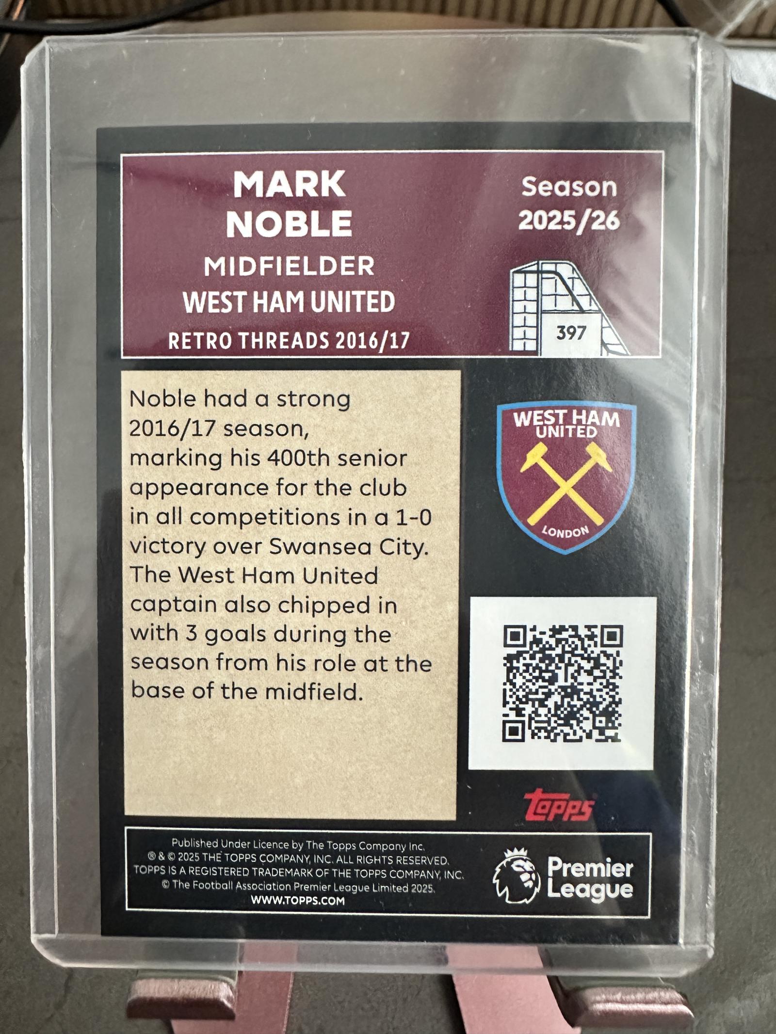 This is a Topps Retro Threads 2016/17 collectible football card featuring Mark Noble, midfielder and captain of West Ham United. The card highlights Noble's strong 2016/17 season, including his 400th senior appearance for the club and his contribution of 3 goals from midfield. Card number 397 from the 2025/26 season Topps set.