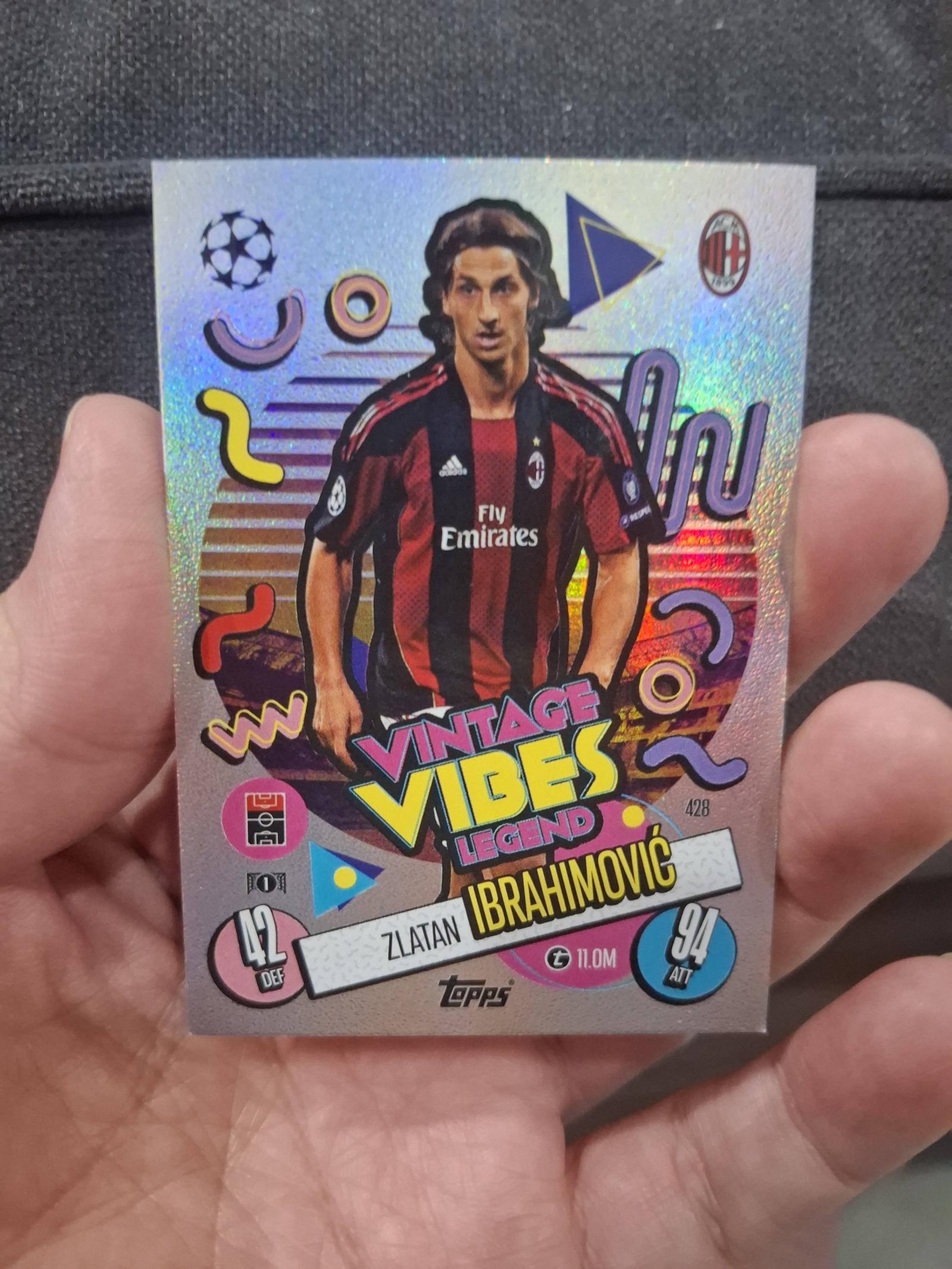 Collectible Topps Vintage Vibes Legend card featuring Zlatan Ibrahimović in AC Milan kit. The card showcases vibrant retro design elements, with player stats displayed (42 DEF, 94 ATT). A great addition for any football or Topps card collector.
