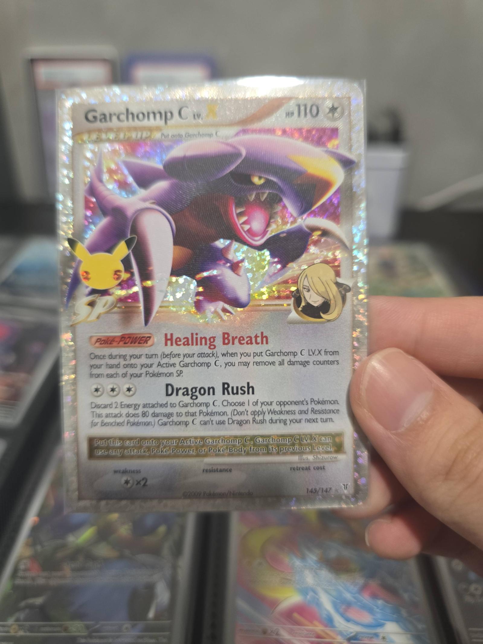 This is a Garchomp C SP holo rare card from the 2009 Pokemon Platinum Arceus set, card number 143/147. Featuring the moves Healing Breath and Dragon Rush, this card showcases a vividly detailed Garchomp with glittery holographic foil. The card is authenticated by distinct markings including the Pikachu SP icon and Cynthia illustration. A great addition for collectors and players alike.