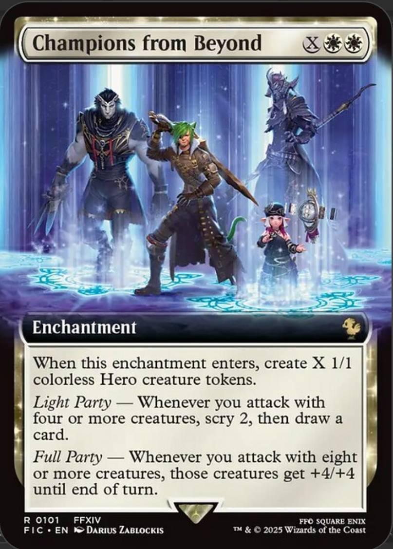 Magic: The Gathering card 'Champions from Beyond' from the FFXIV set. It is an enchantment that creates X 1/1 colorless Hero creature tokens when it enters the battlefield. The card features abilities Light Party and Full Party that modify gameplay when attacking with multiple creatures. Illustrated by Darius Zablockis. Rare card in English, set 0101.