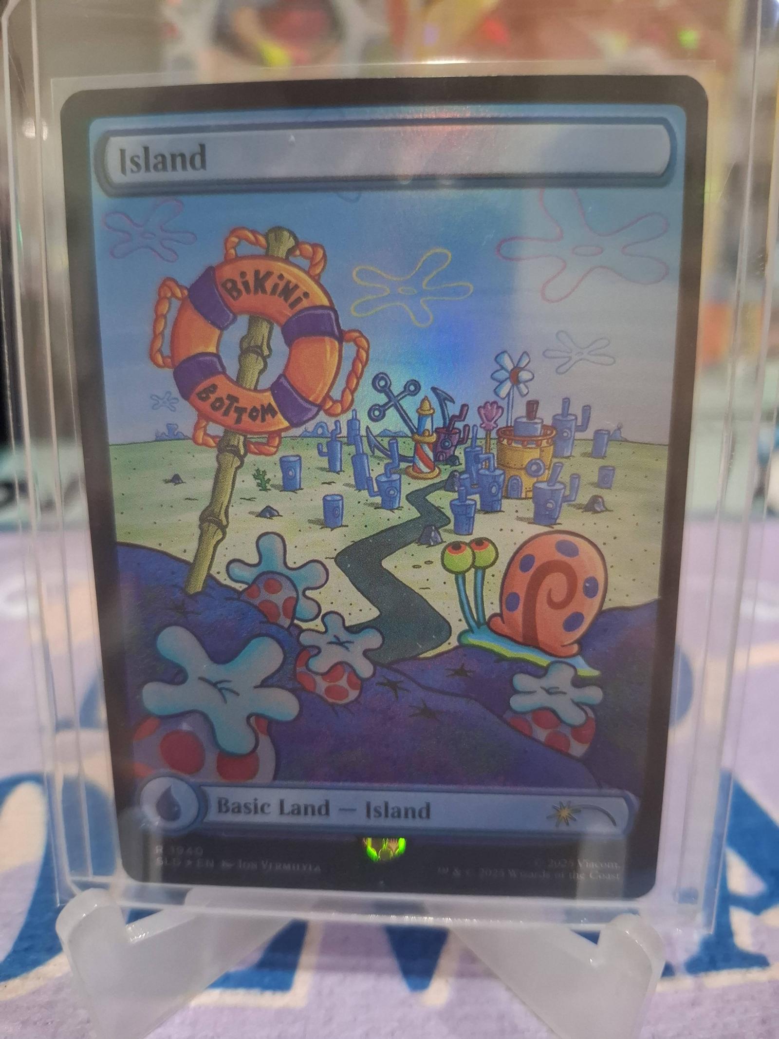 Notable features: Promotional artwork with a recognizable Bikini Bottom theme, holographic/foil finish visible in photos, and full-art illustration that replaces the typical basic land artwork. This is a novelty/crossover promo that appeals to collectors of pop-culture crossovers, alternate art MTG lands, and fans of themed play sets.