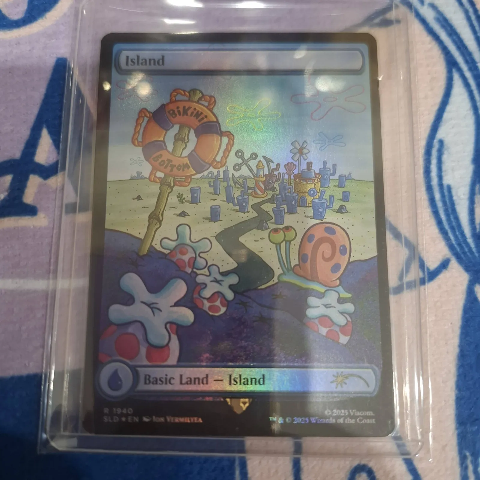 Near Mint, ungraded promotional Magic: The Gathering basic land — Island with Bikini Bottom artwork. This is a promo/novelty basic land featuring a colorful, SpongeBob-inspired scene (Bikini Bottom life ring, Gary the snail and background town). The card displays a visible holographic sheen under light and is printed as a special promo illustration rather than a regular set land.