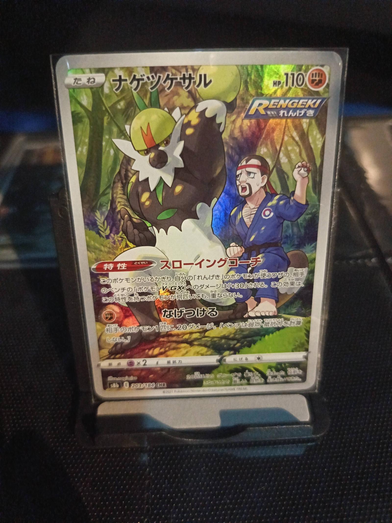 This is a Japanese Pokémon Trading Card Game rare Trainer card from the Rengeki series, numbered 203/184 CHR. The card features unique artwork of a Pokémon character alongside a trainer, showcasing vivid holographic foil with excellent gloss and color saturation. The card appears well-preserved without noticeable edge wear, creasing, or surface scratches. Ideal for collectors seeking rare and authentic Japanese Pokémon cards.