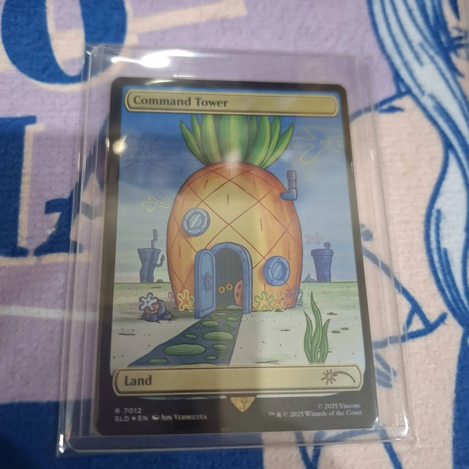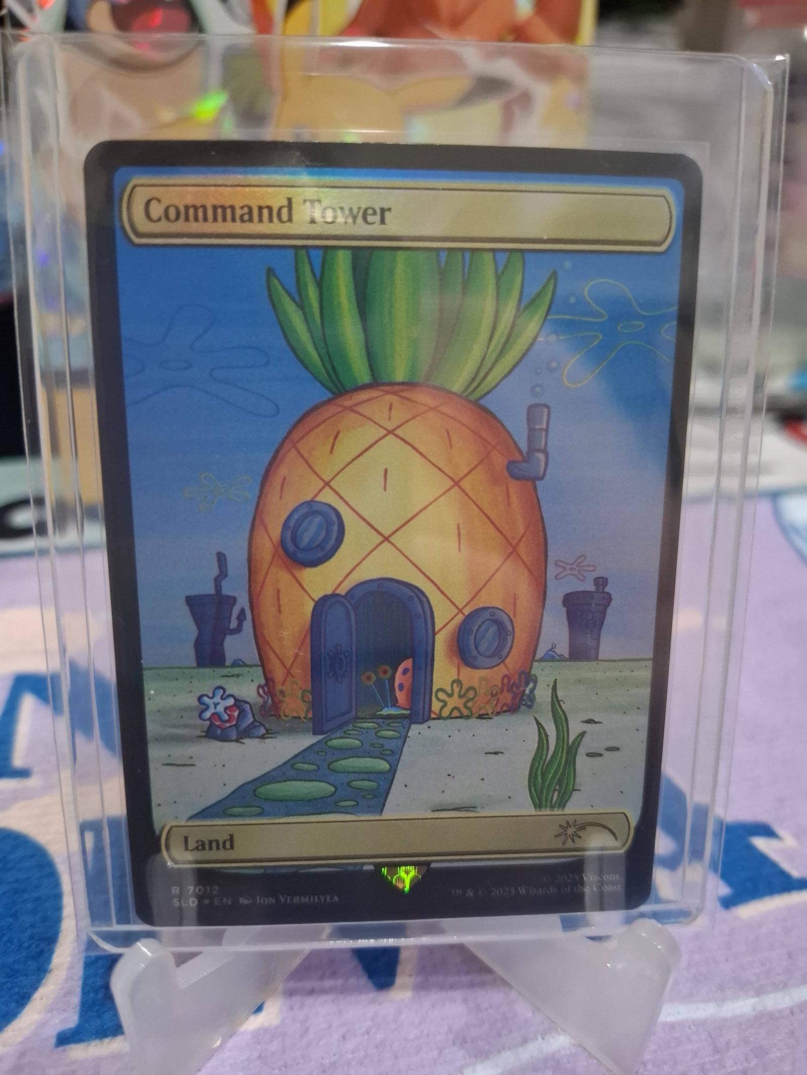 Playability and collectible value: Command Tower is a staple land in multiplayer/Commander formats, so this piece carries both gameplay utility and collector appeal. The SpongeBob crossover artwork makes it especially desirable to collectors of pop-culture variants, Commander players who like unique proxies/promos, and fans of the artist. Being an ungraded near-mint promo with intact corners and surface, it’s well-suited for display or play in sleeve-protected decks.