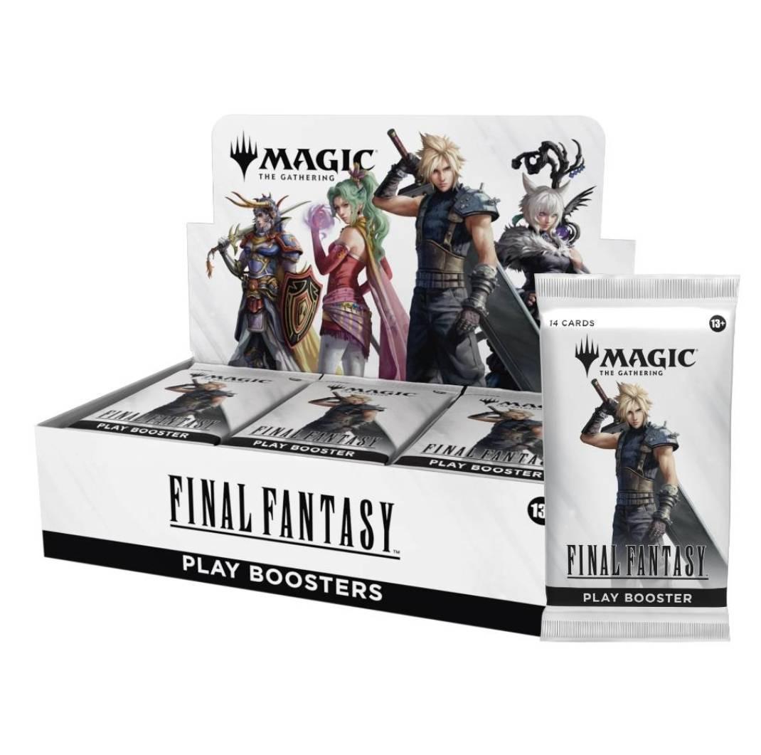 This is a sealed booster box containing Magic: The Gathering Final Fantasy Play Boosters. The box features iconic Final Fantasy characters and includes packs of 14 cards each. Perfect for collectors and players looking to enhance their decks with unique crossover cards.