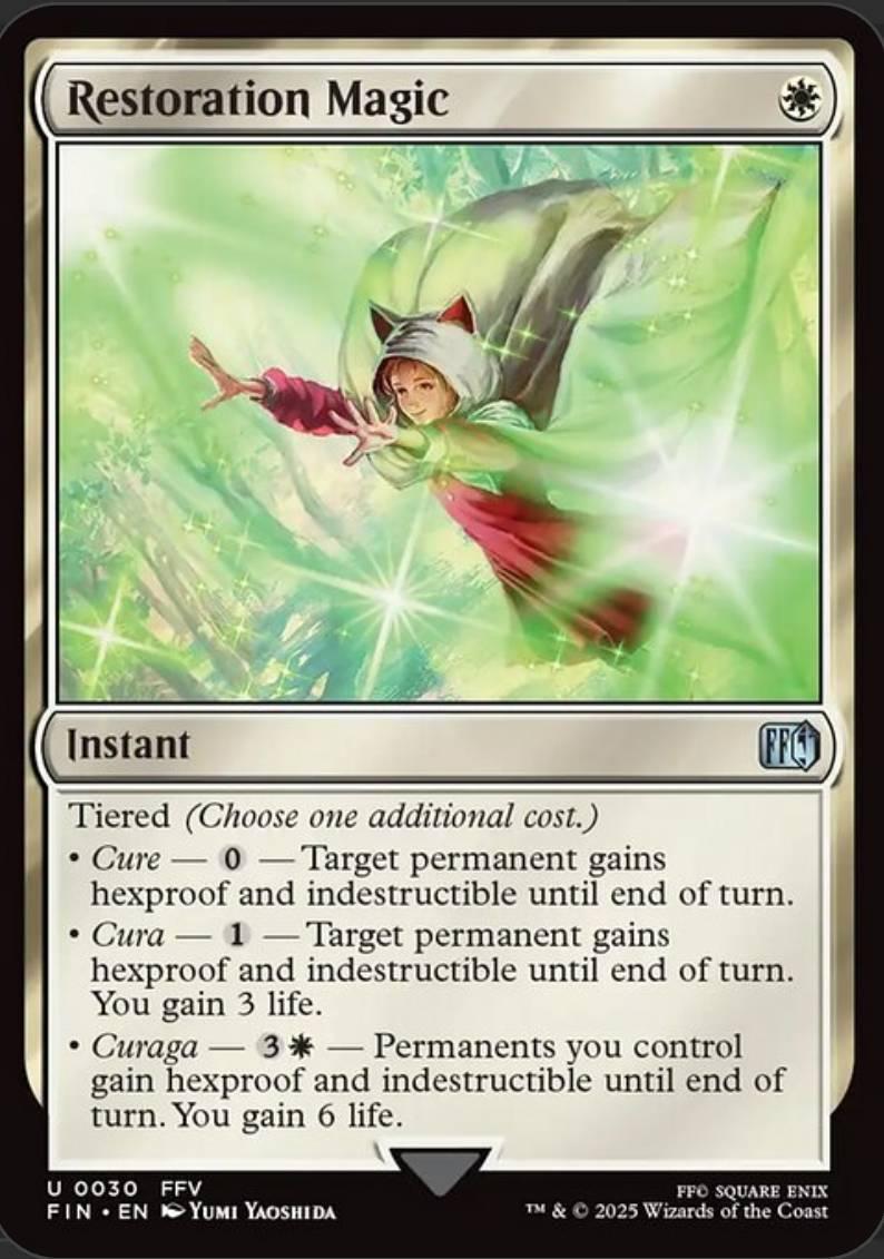 Restoration Magic is a white instant card from the Final Fantasy set of Magic: The Gathering. It features tiered effects granting hexproof and indestructible to permanents, along with life gain abilities depending on the chosen cost. Illustrated by Yumi Yaoshida, this card is a rare find for collectors and players alike.