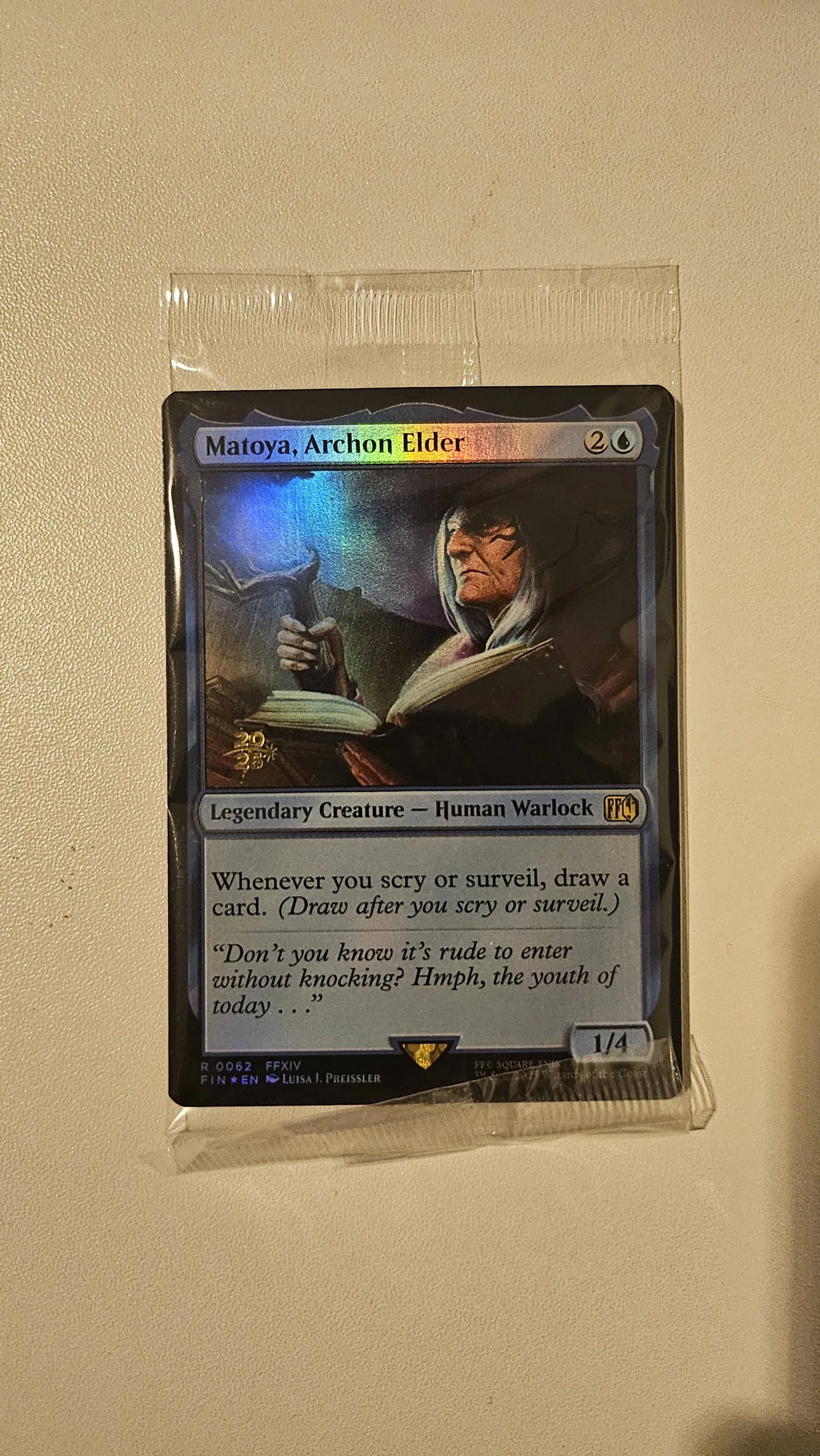 This is a foil promotional 'Matoya, Archon Elder' card from the Final Fantasy XIV collaboration with Magic: The Gathering. The card features a legendary creature, Human Warlock, with abilities tied to drawing cards upon scry or surveil. It comes in a protective sleeve, showing vibrant foil quality and clear artwork.