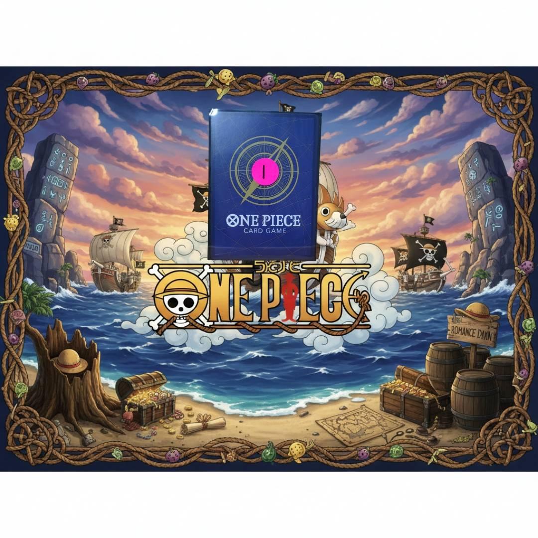 A One Piece Card Game playmat featuring iconic characters and scenery from the anime series, along with a blue deck box branded with the One Piece Card Game logo. The playmat is colorful and detailed, perfect for enhancing gameplay and collector display. The deck box appears to be in good condition, suitable for storing cards securely.