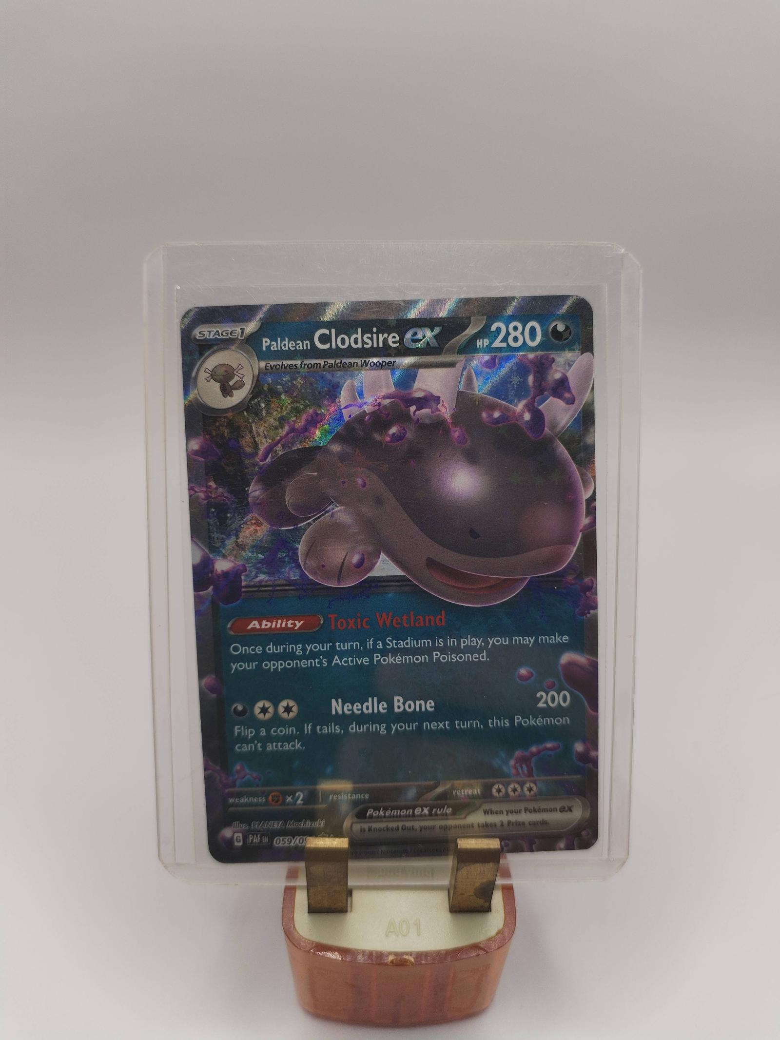 This is a holographic Paldean Clodsire ex Pokémon card from the Trading Card Game. It features the Ability 'Toxic Wetland' and the attack 'Needle Bone.' The card evolves from Paldean Wooper and has 280 HP. Card is in a protective sleeve and displayed on a stand.*Photos shown are the actual card you will receive.