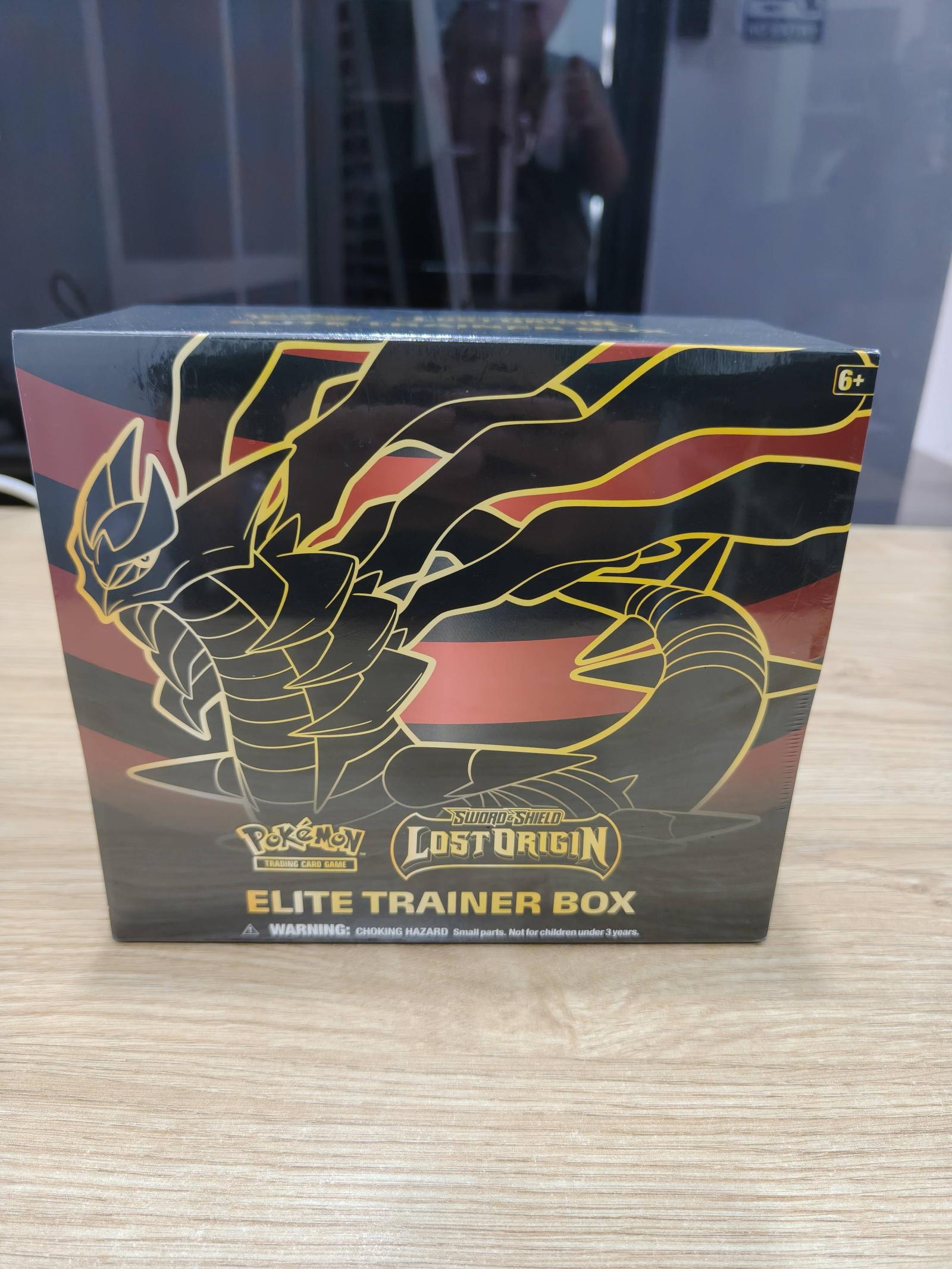 A sealed Pokémon Trading Card Game Sword & Shield Lost Origin Elite Trainer Box. The box features artwork of Giratina and contains multiple booster packs and game accessories. Suitable for ages 6 and up. This item is brand new and unopened, perfect for collectors and players alike.
