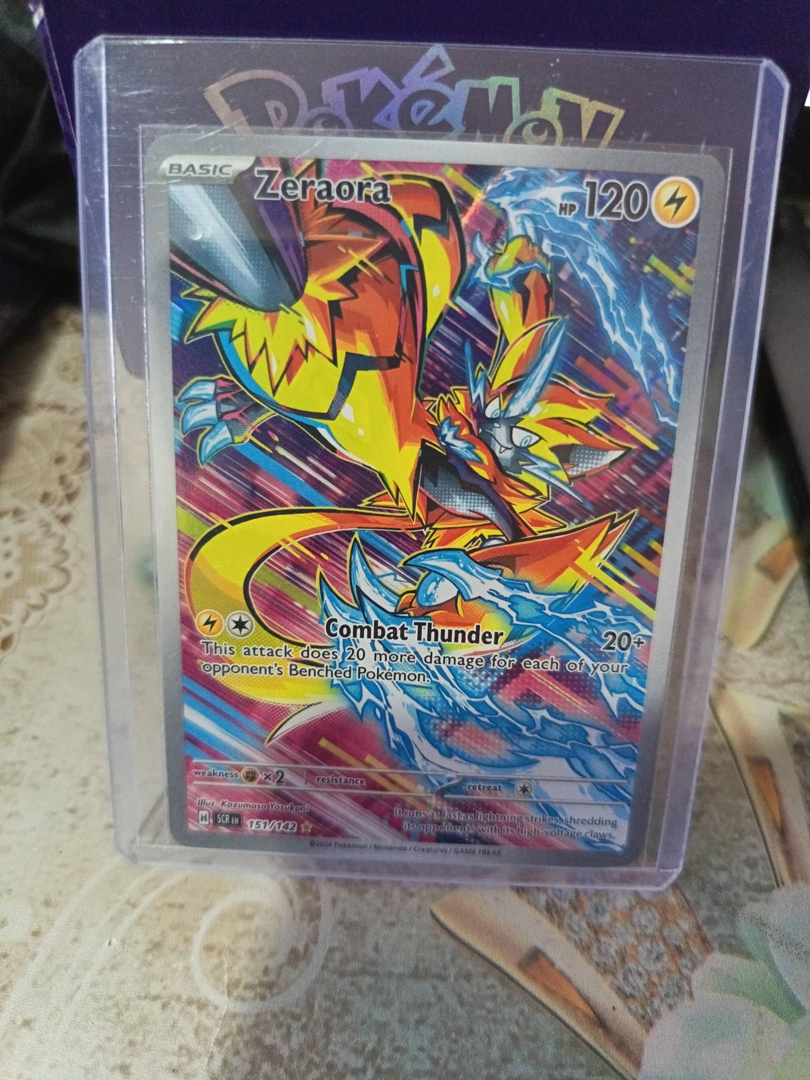 A Zeraora Full Art Secret Rare card from the Pokémon Trading Card Game, numbered 151/142. The card features vibrant holographic artwork and is encased in a protective sleeve. Suitable for collectors and players interested in powerful Electric-type Pokémon cards.