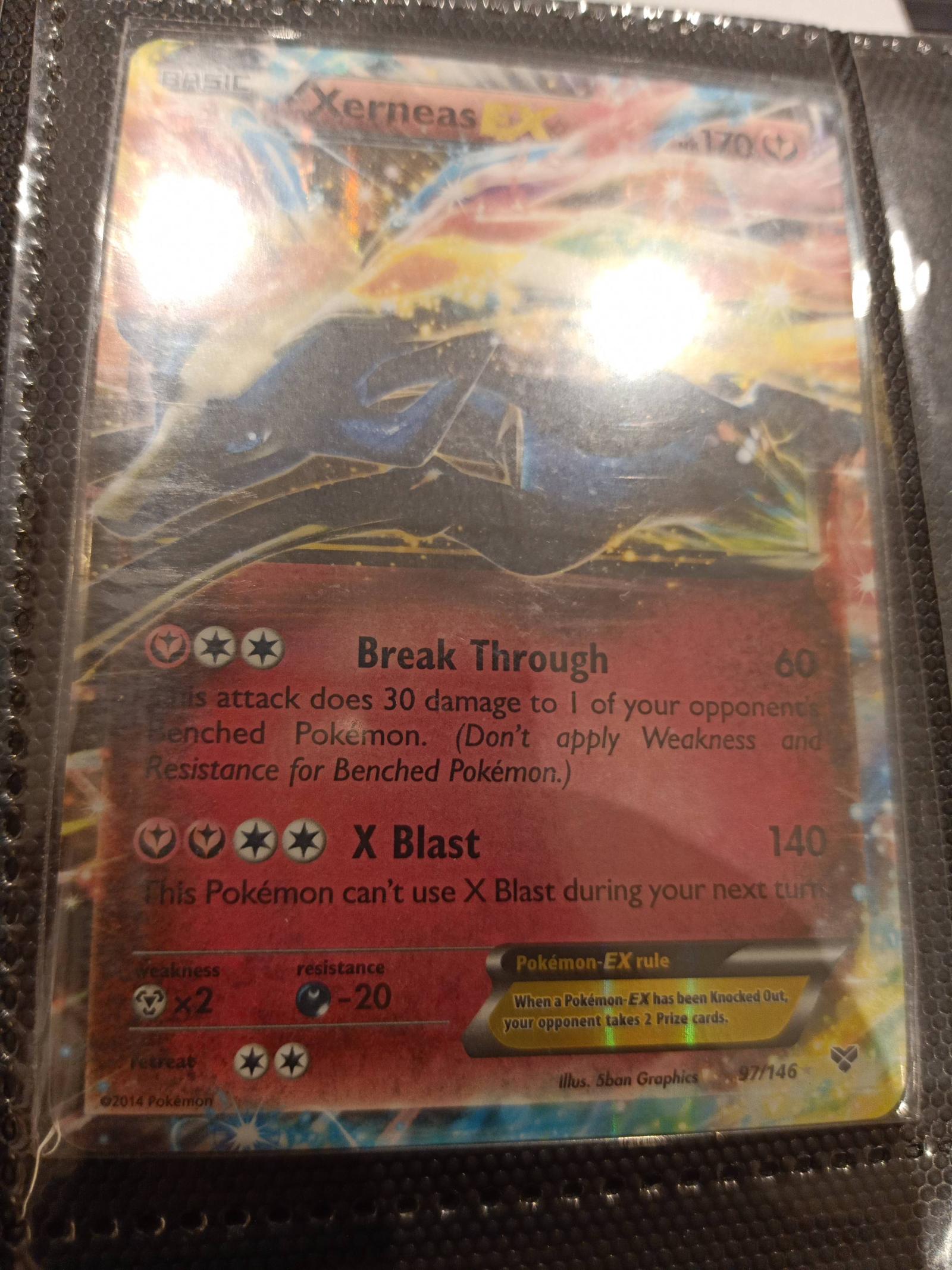 This is a 2014 Pokémon Trading Card Game card featuring Xerneas EX. The card is holofoil with attacks 'Break Through' and 'X Blast'. It is card number 97 out of 146. The card shows visible surface wear and scratches from handling.