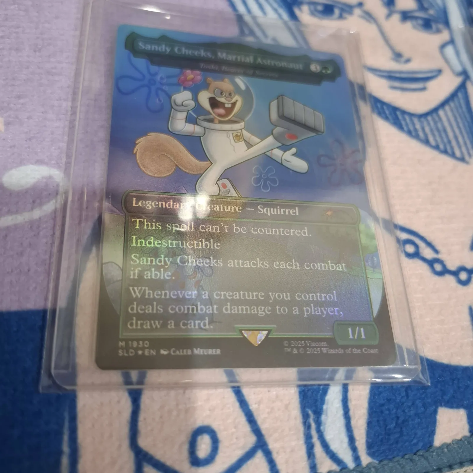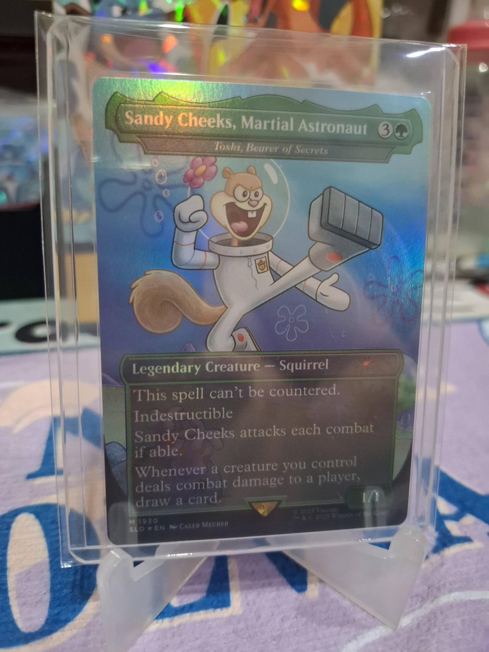 A foil Magic: The Gathering card featuring Sandy Cheeks, Martial Astronaut, a legendary squirrel creature. The card includes abilities such as being indestructible and the ability to draw cards when combat damage is dealt by controlled creatures. This card is in a protective sleeve and display stand.