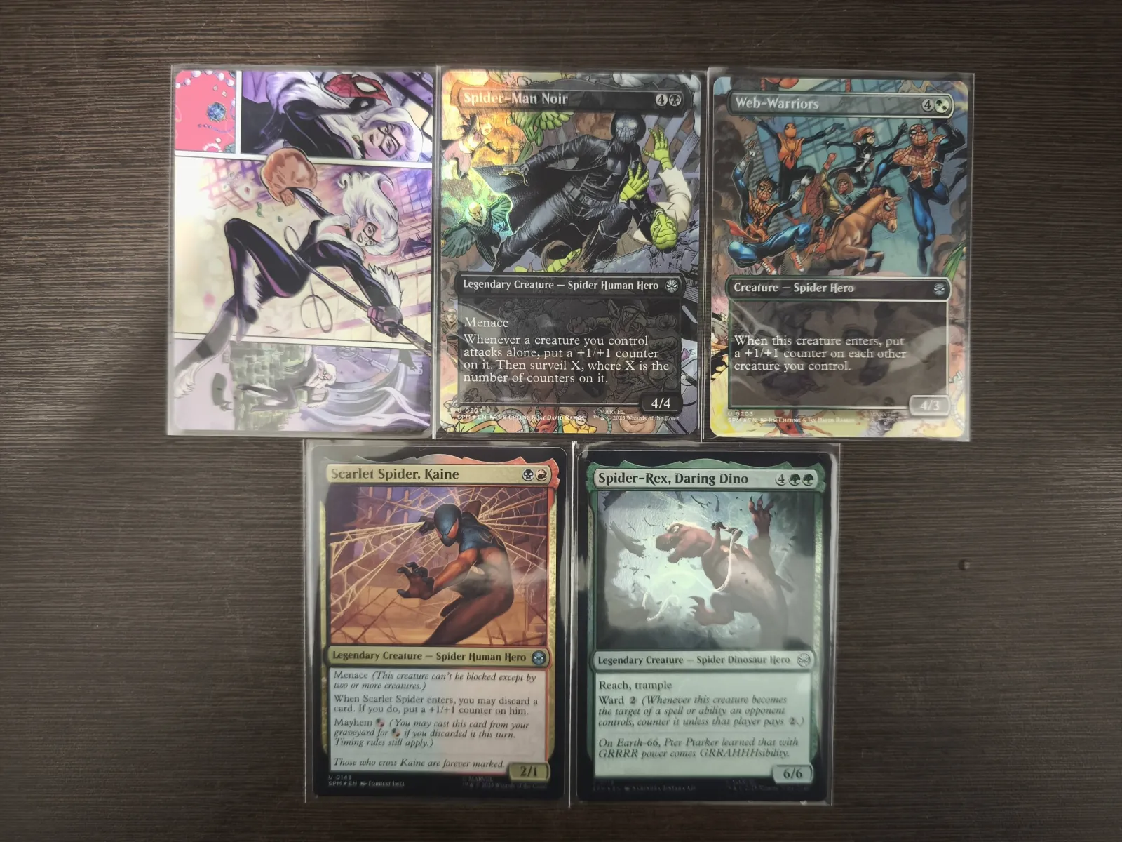 A set of five Spider-Man themed Magic: The Gathering cards featuring Spider-Ex, Scarlet Spider Kaine, Web-Warriors, Spider-Man Noir, and a Black Cat art card. These are special promo or custom cards inspired by the Spider-Man universe, showcasing dynamic artwork by Rough Studios. No grading or slabbed status indicated.
