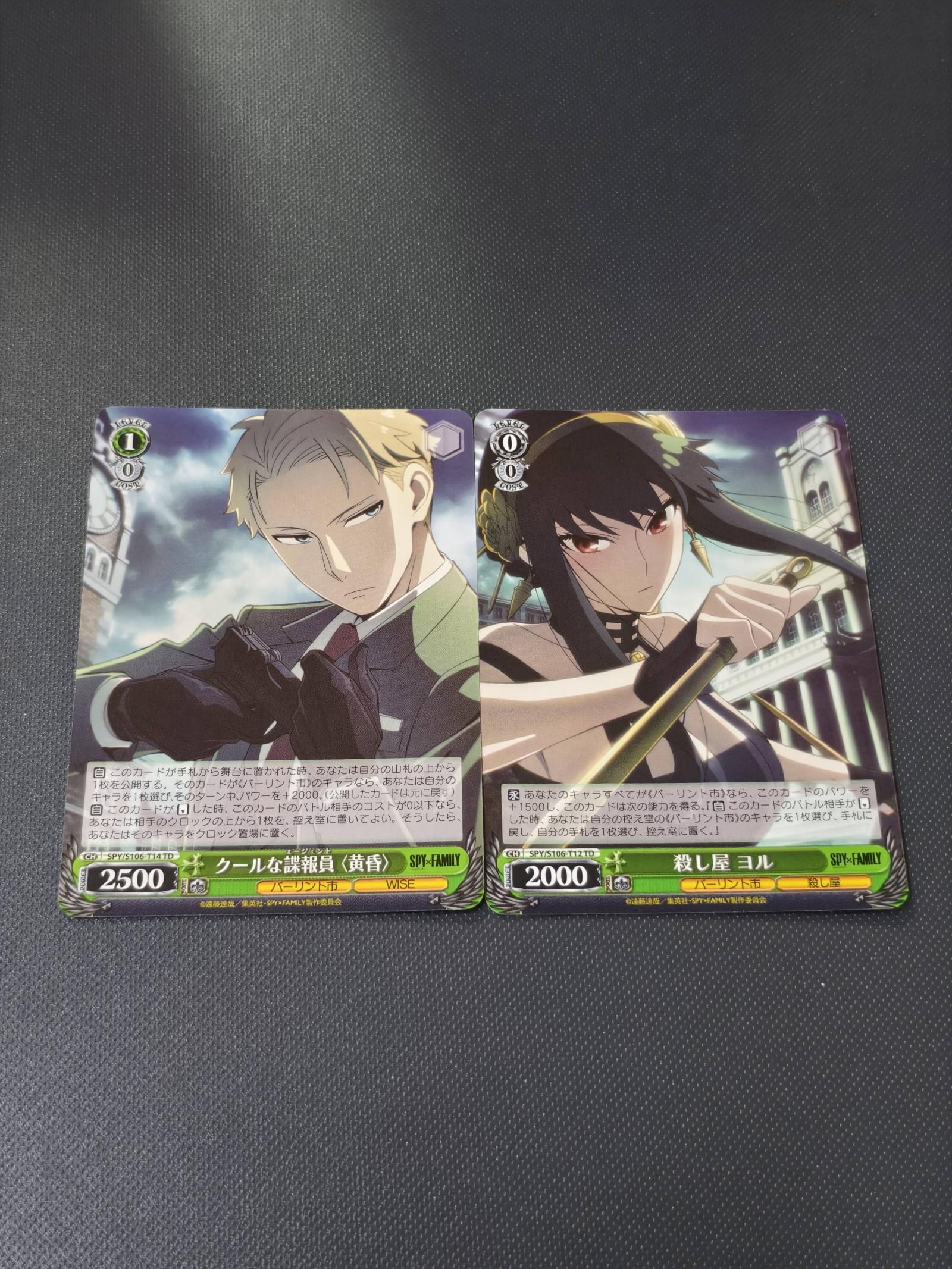 SPY×FAMILY - Loid Forger (Cool Agent) and Yor Forger (Assassin). Both cards are Japanese edition from the Weiss Schwarz TCG