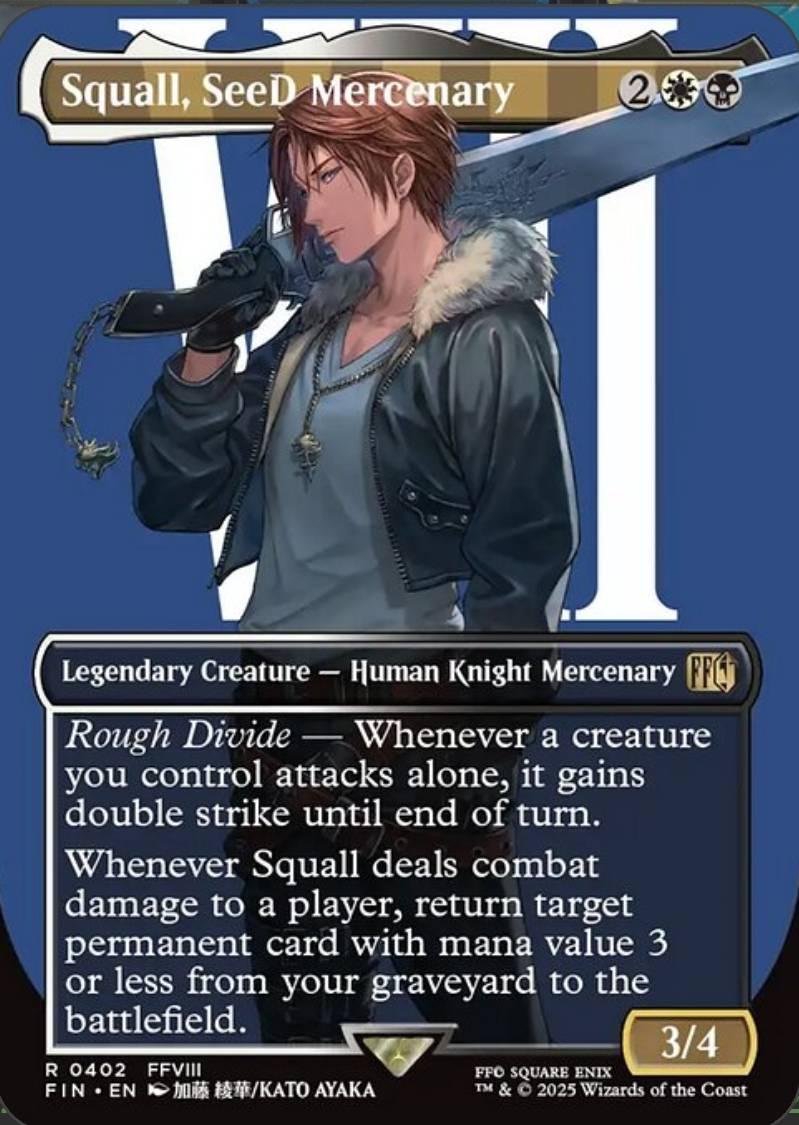 A Magic: The Gathering card featuring Squall, SeeD Mercenary from the Final Fantasy VIII set. This card has the abilities Rough Divide and returns permanent cards with mana value 3 or less from your graveyard to the battlefield. Level 3/4 power and toughness.