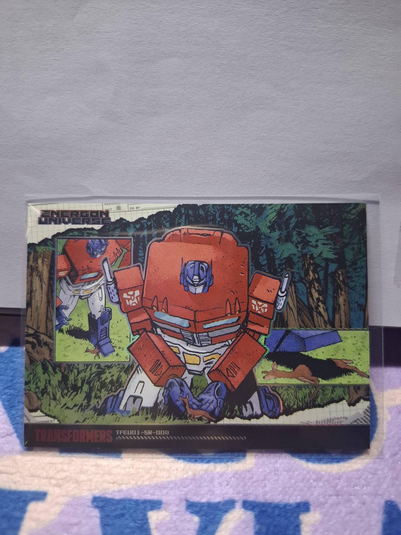 This Transformers Energon Universe trading card features a comic style illustration of Optimus Prime in a forest scene. The card is part of the TFEU01 set and has vibrant colors with detailed artwork. It is ideal for collectors of Transformers and trading card games.