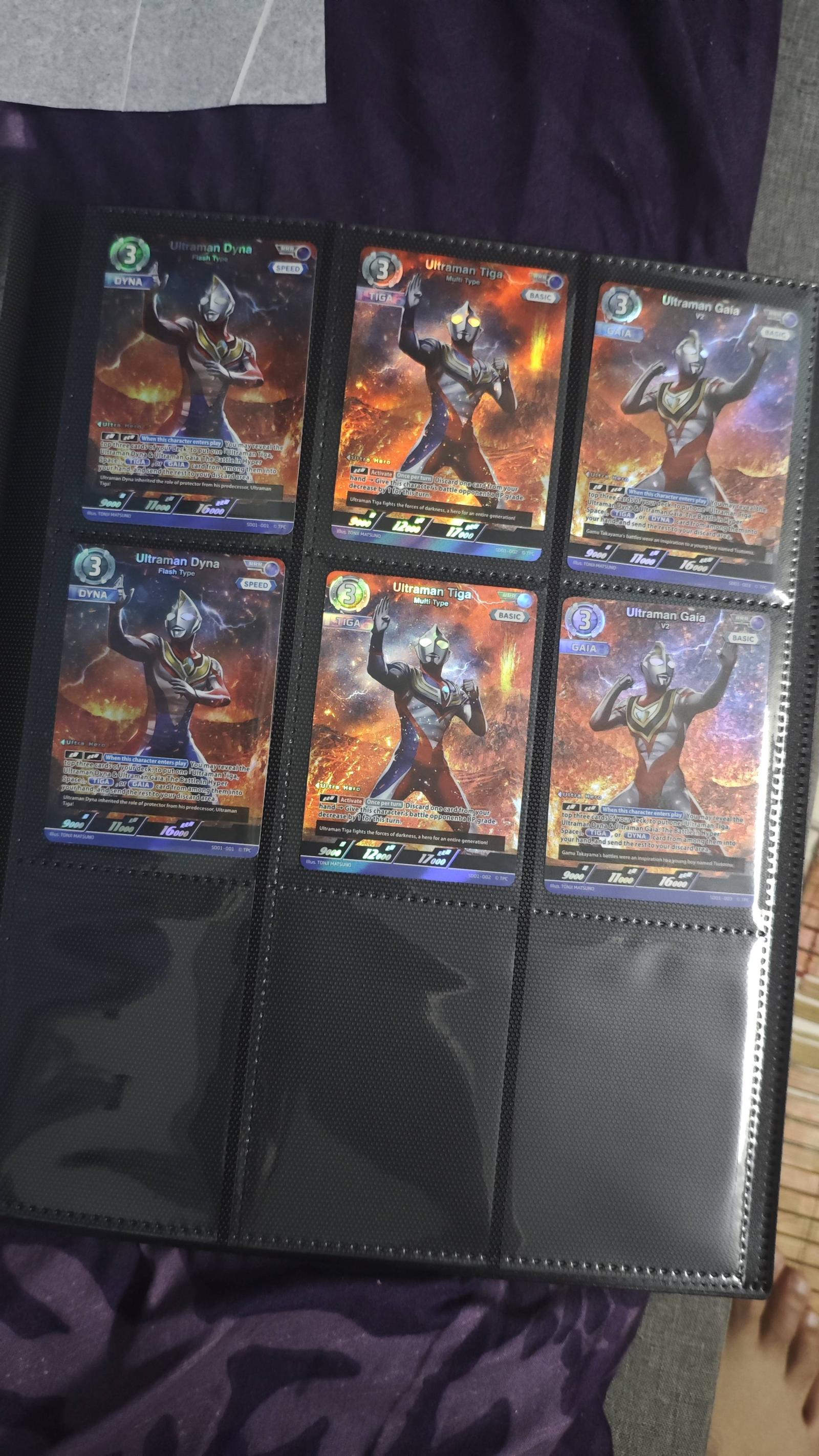 Additional observations: Photos show two copies of each hero in the binder pockets — listing is for one 3‑card set (one card each of Tiga, Dyna, Gaia). Cards are sleeved; please inspect provided images for condition details. No major damage noted in the supplied images, but small surface wear consistent with prior handling is possible on ungraded foils.