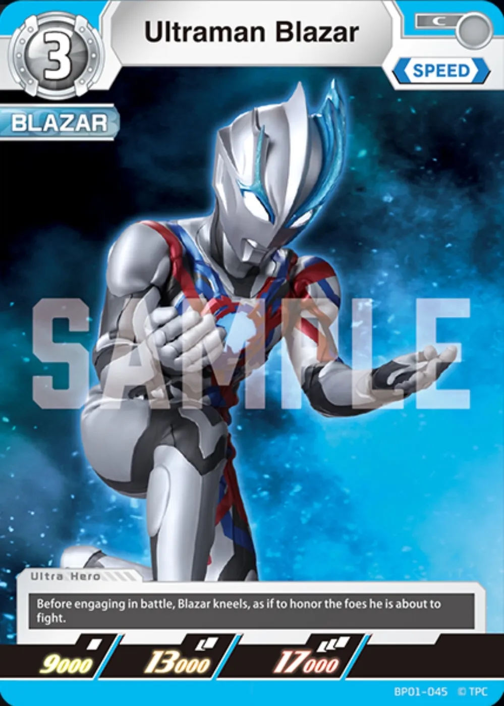 With power stats of 9000, 13000, and 17000, it emphasizes Blazar's strength and speed attributes in gameplay. As a common rarity card, it is accessible to collectors and players alike.