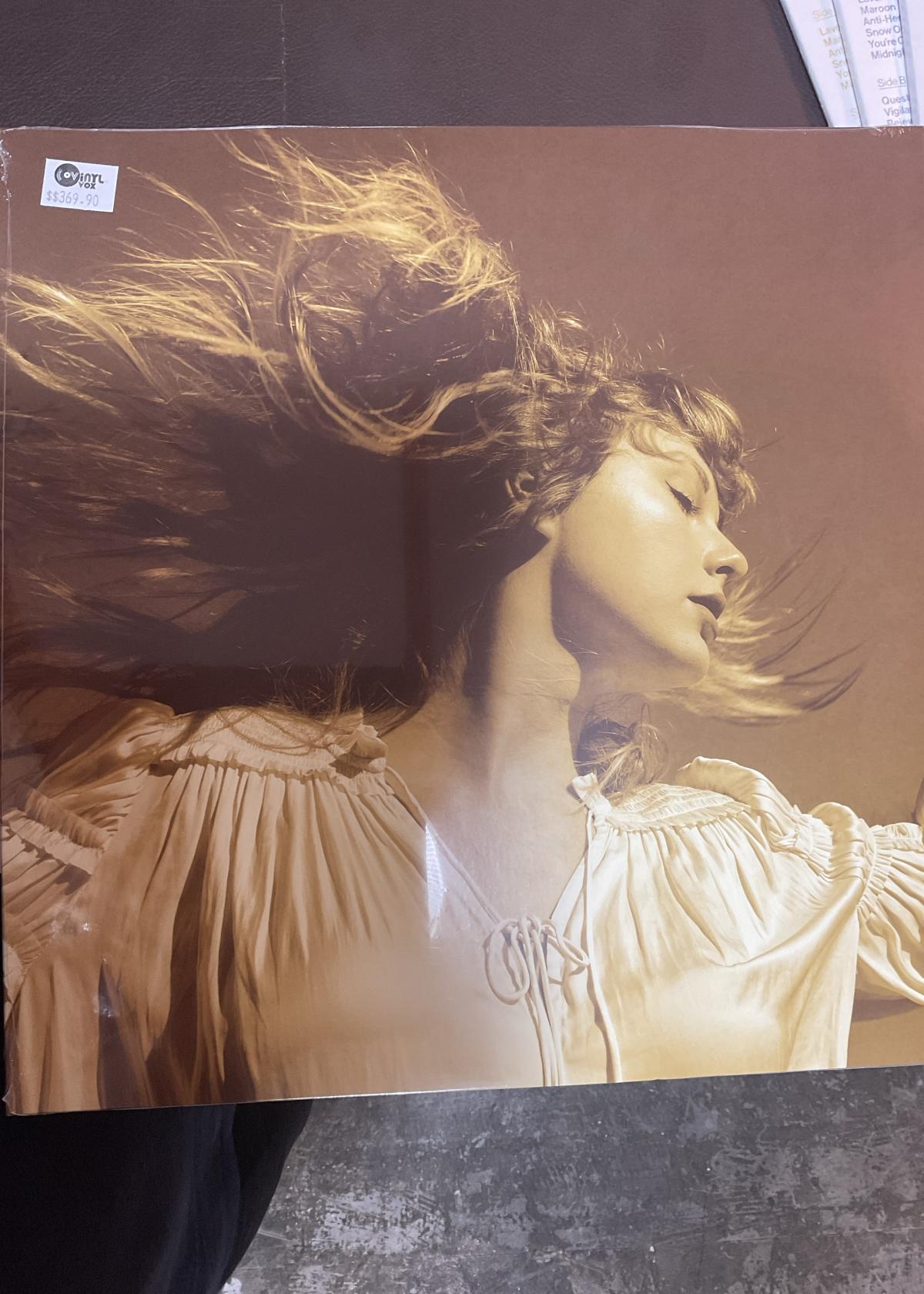 This is a vinyl record of Taylor Swift's 'Fearless (Taylor's Version)'. The cover features a sepia-toned image of the artist with windswept hair. This collectible item is ideal for fans of pop and country music, and it comes in its original packaging with a price sticker visible on the upper left corner. There is no visible damage or wear, making it a great addition to any music lover's collection.