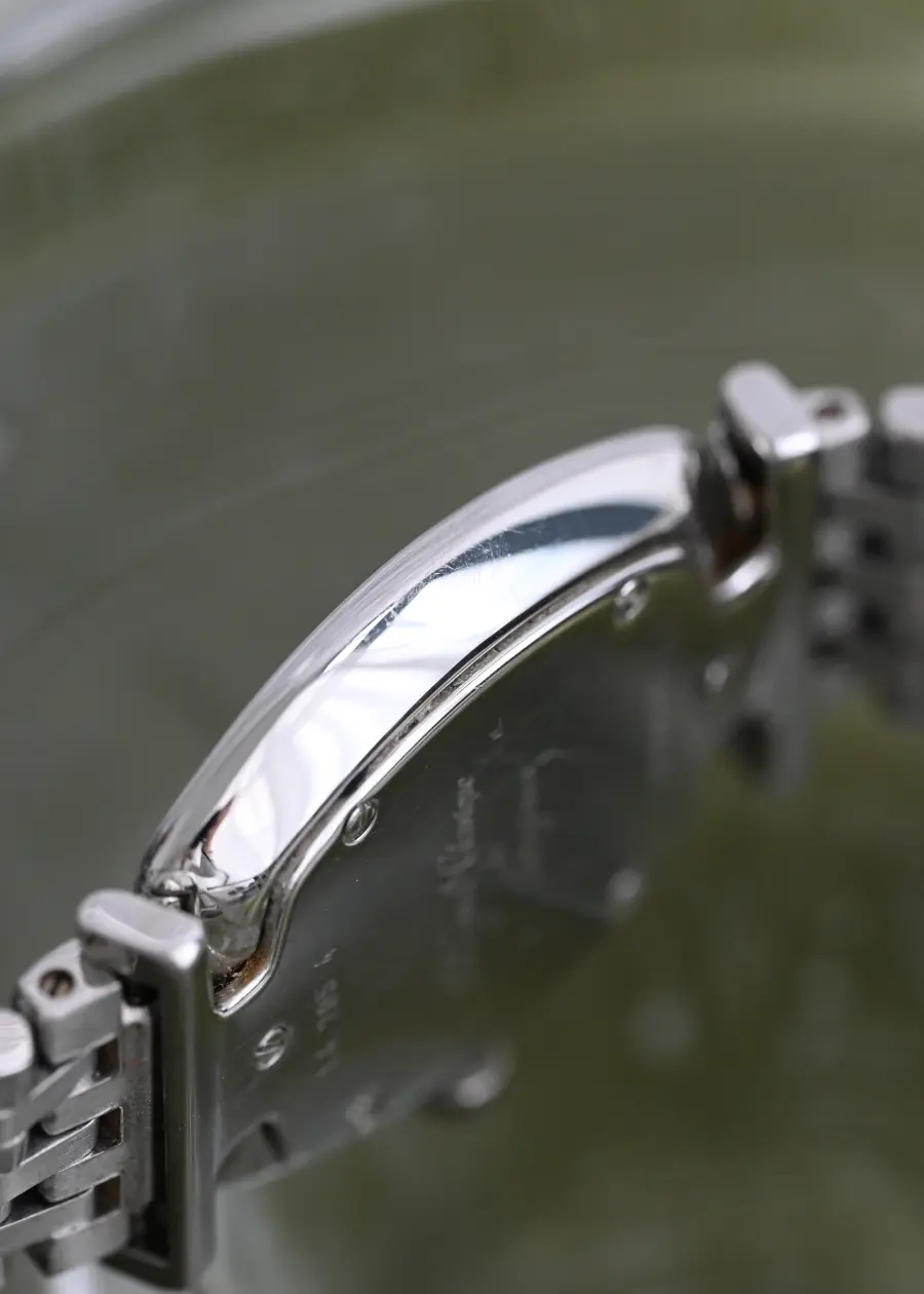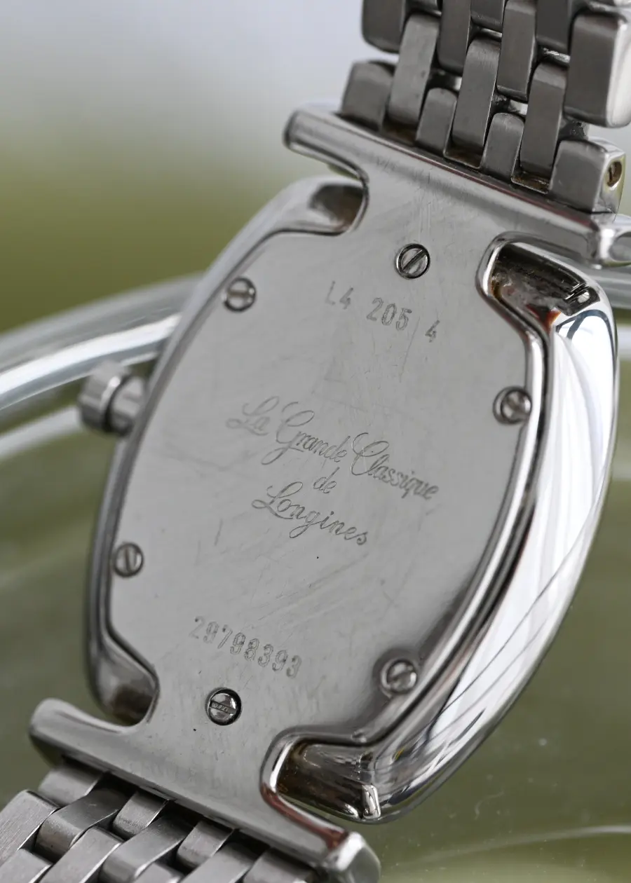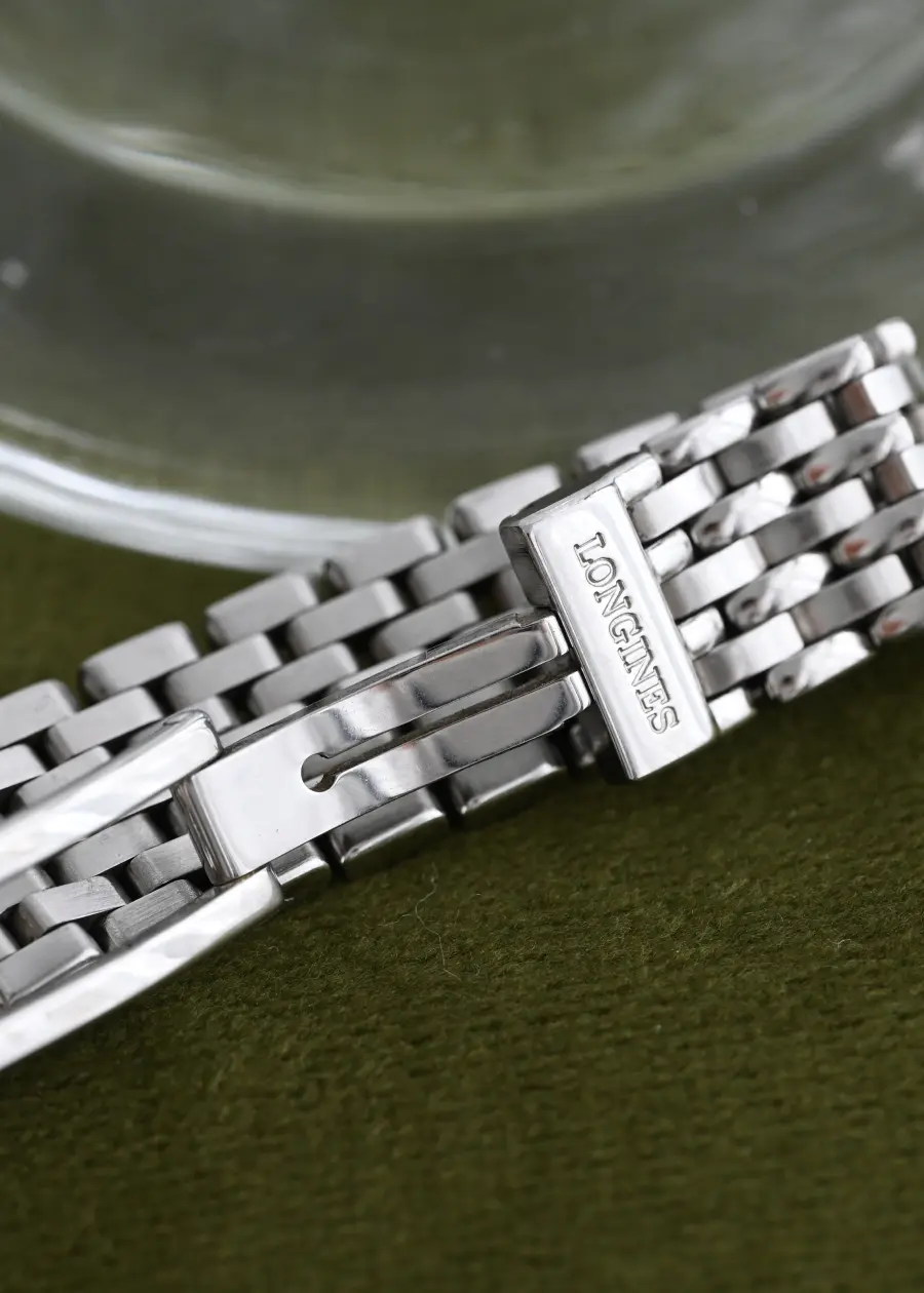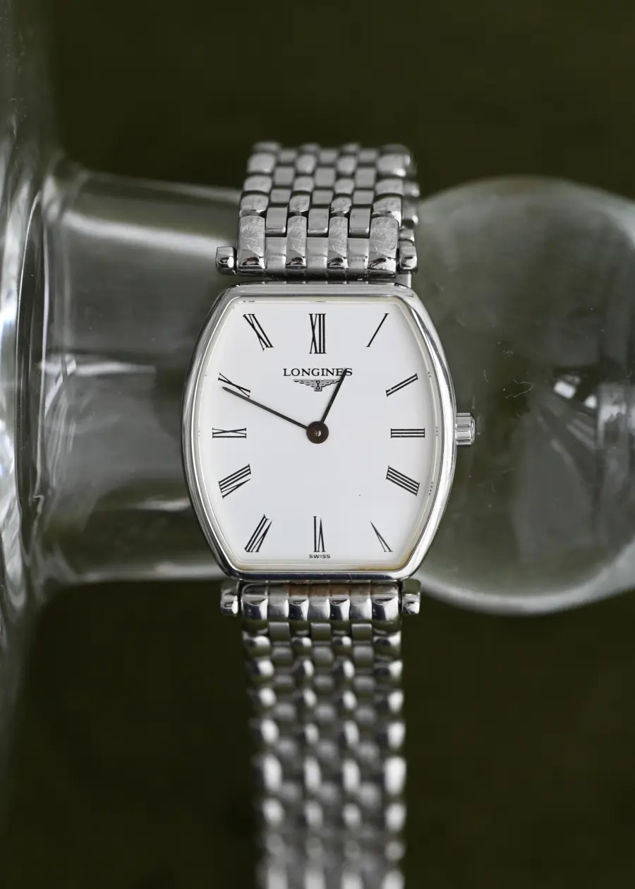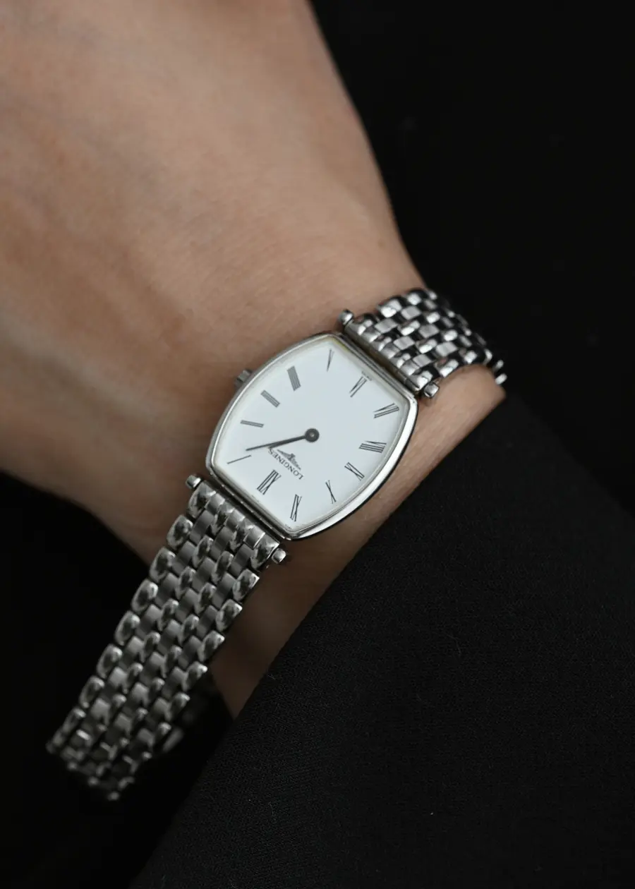 This Longines timepiece blends vintage grace with modern simplicity — featuring a clean white dial, slender Roman numerals, and a refined tonneau-shaped case. Paired with a classic multi-link bracelet, it’s a study in understated elegance that effortlessly elevates any wrist.