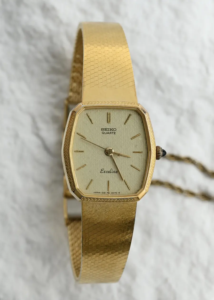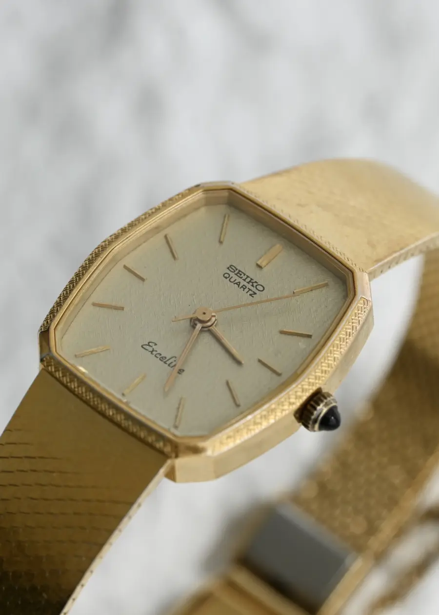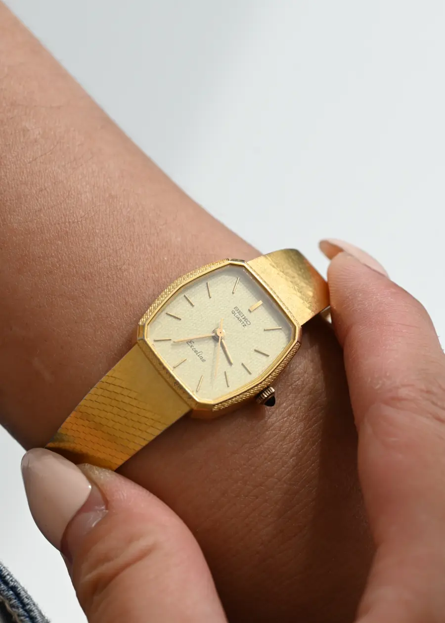 Gold from dial to clasp, this Seiko Exceline doesn’t whisper vintage — it hums it in perfect quartz rhythm. Textured, angular, and effortlessly poised.