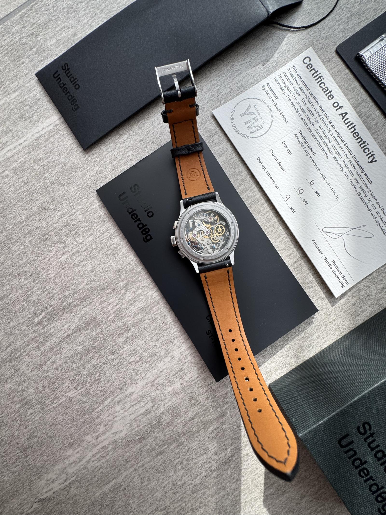 This Studio Underd0g (Gen3) mechanical chronograph watch features a visible movement through a transparent case back, a textured dial with dual subdials, and a black leather strap with tan underside. It comes complete with original box, certificate of authenticity, and user manual. The watch shows minimal signs of wear and has clear documentation of its precision and performance, making it a desirable collectible for enthusiasts.