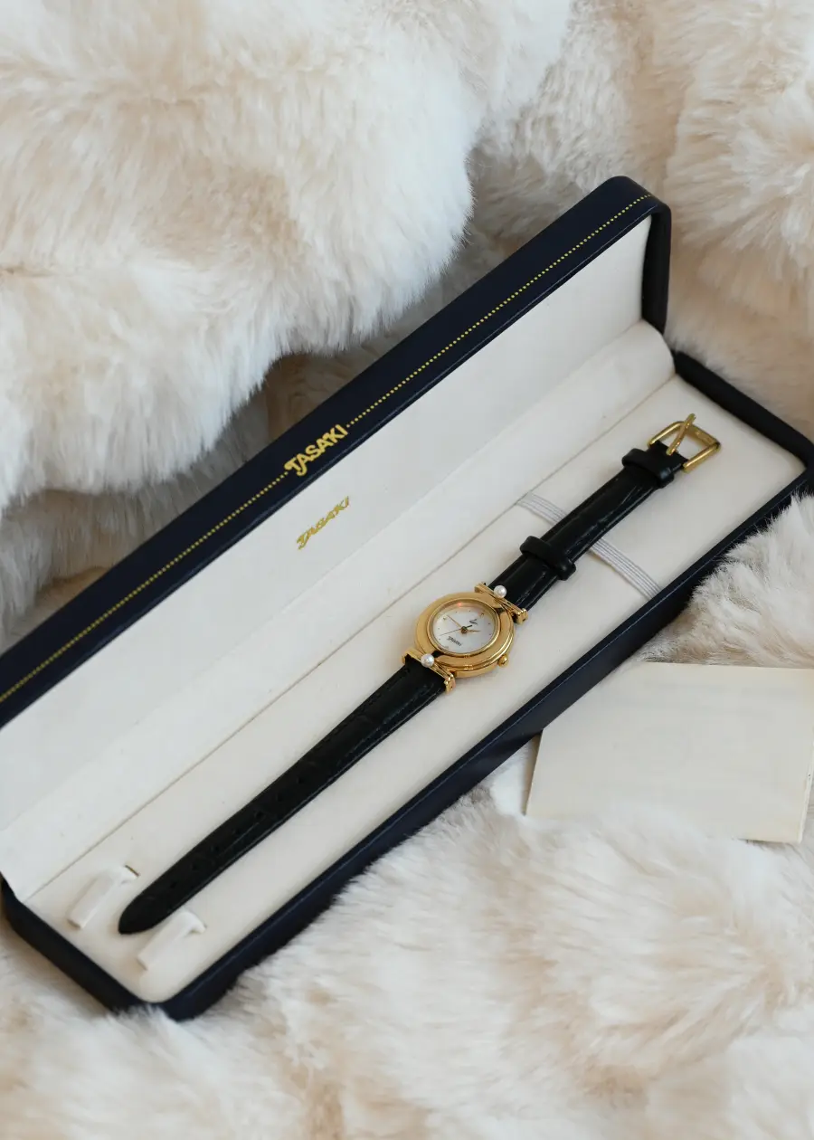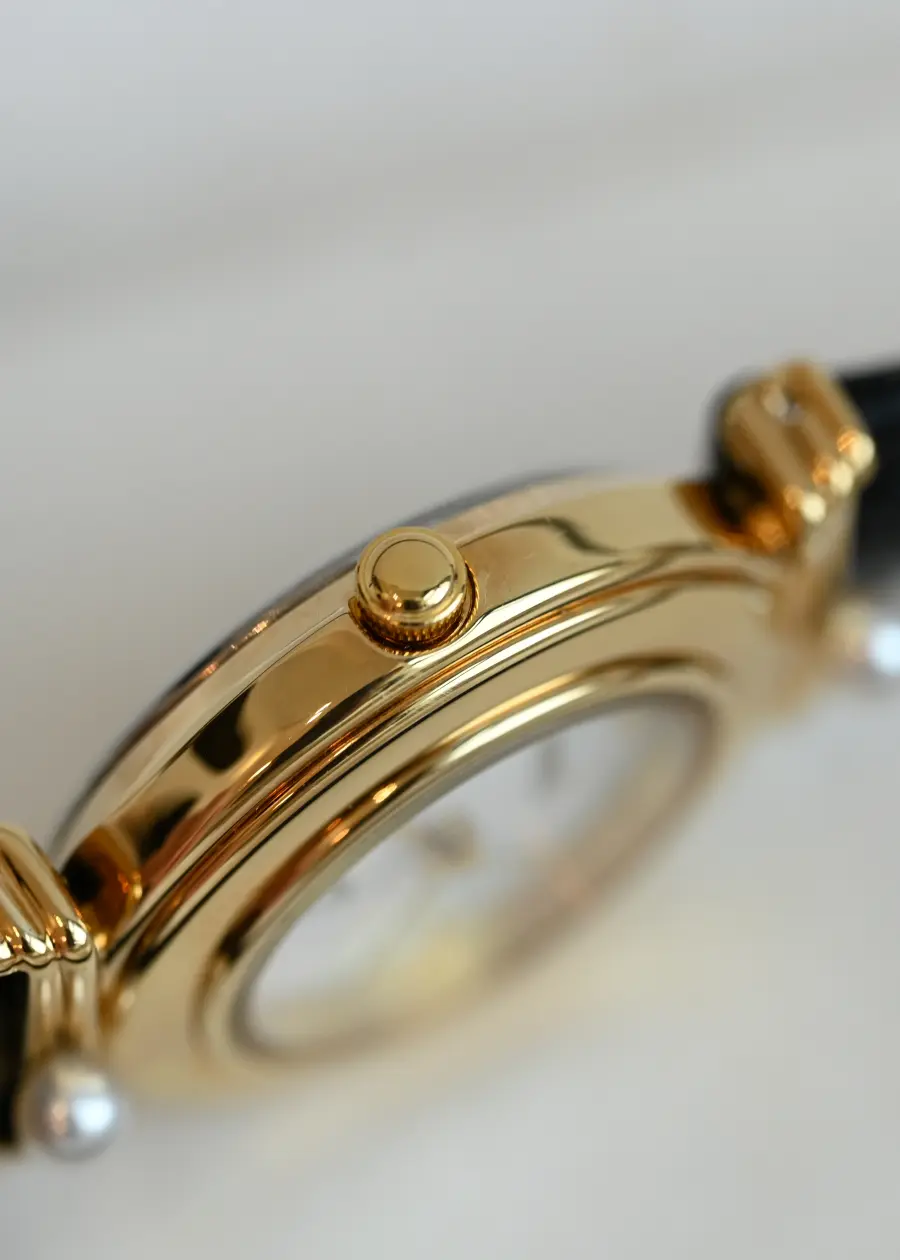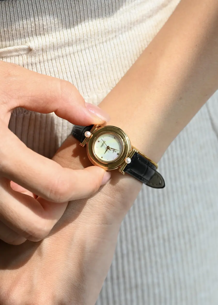 Moonlight on Your Wrist. With a mother-of-pearl dial and pearls poised like stars, this is time dressed in poetry. Gold curves, pearl kisses, and a dial that catches every kind of light.