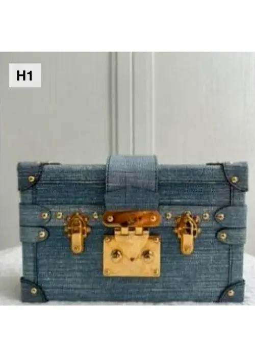 Brand: Louis Vuitton Bag Name: Petite Malle Color/Material: Blue Denim Canvas with Black Leather Trim Hardware: Gold-tone S-lock and trunk-style hardware