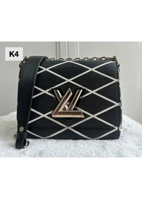 Brand: Louis Vuitton Bag Name: Twist MM Color/Material: Black Epi Leather with White Diagonal Graphic Stitching Hardware: Silver-tone LV twist-lock closure and chain strap
