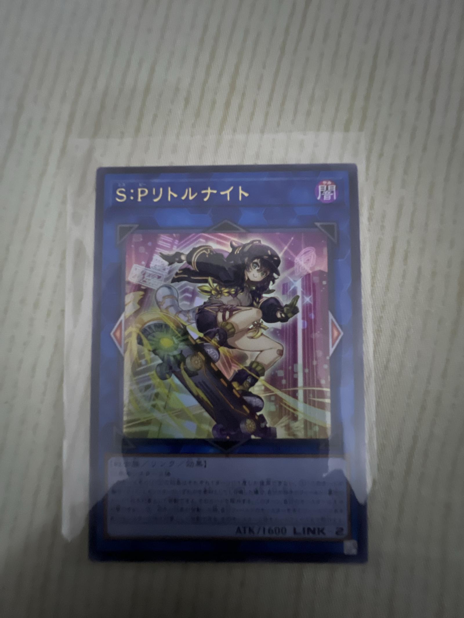 A Yu-Gi-Oh! trading card featuring the S:P Little Knight Link Monster, with 1600 ATK and Link 2 rating. The card is in Japanese language, showing vibrant artwork of the character riding a skateboard. Suitable for collectors and players of the Yu-Gi-Oh! TCG.