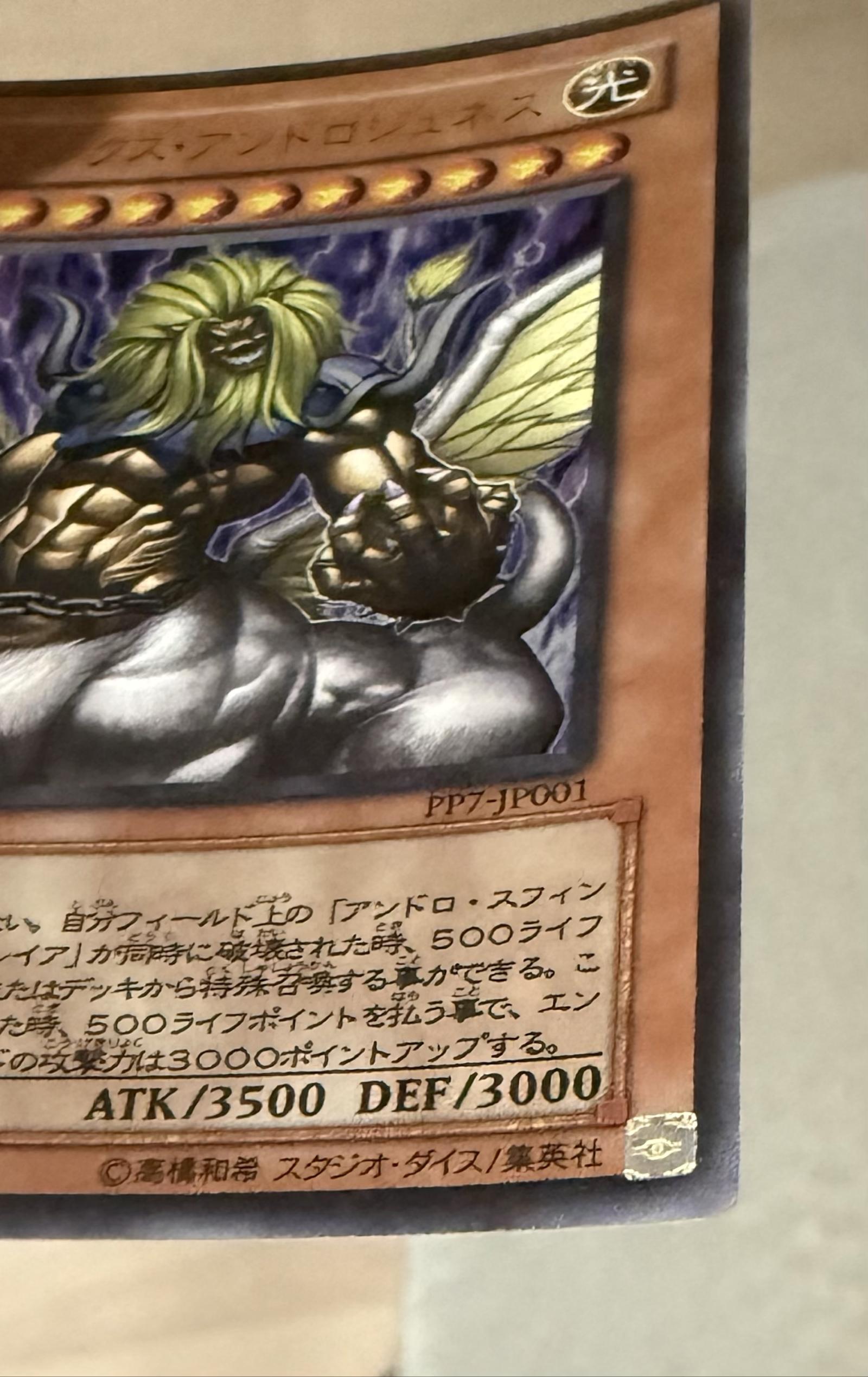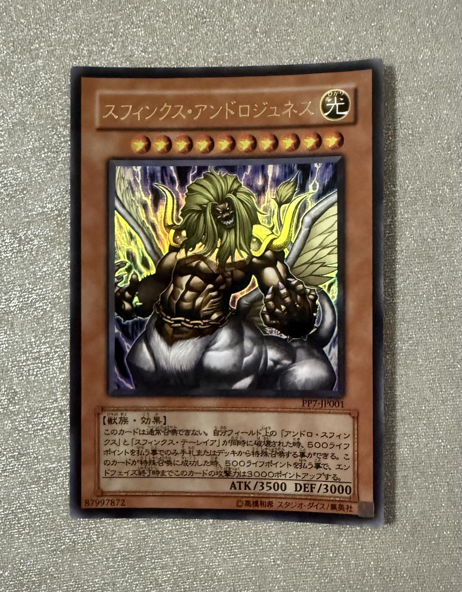 Japanese Yu-Gi-Oh! Trading Card Game card 'Sphinx Androjaness' from the PP7 set. Card number PP7-JP001. This card features artwork of a powerful monster with 3500 ATK and 3000 DEF. Card condition visible in photos. Collector's item or for Yu-Gi-Oh! gameplay. No foil or special printing treatment evident.